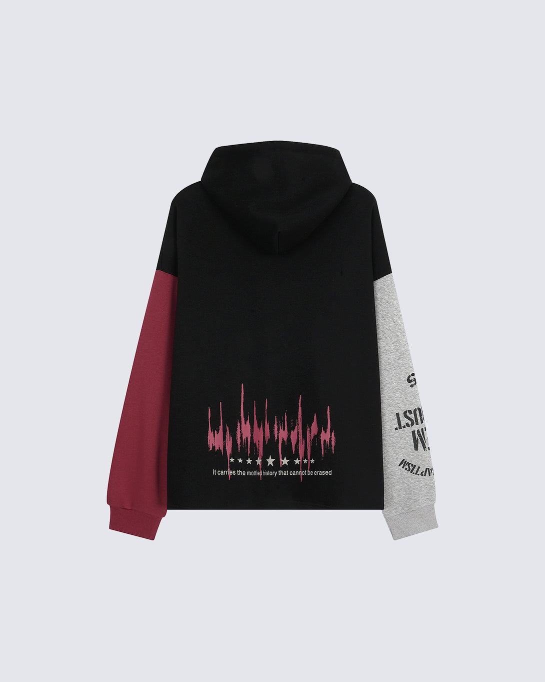 Color-block splicing, drawstring hood, loose fit, pullover style, ribbed cuffs and hem