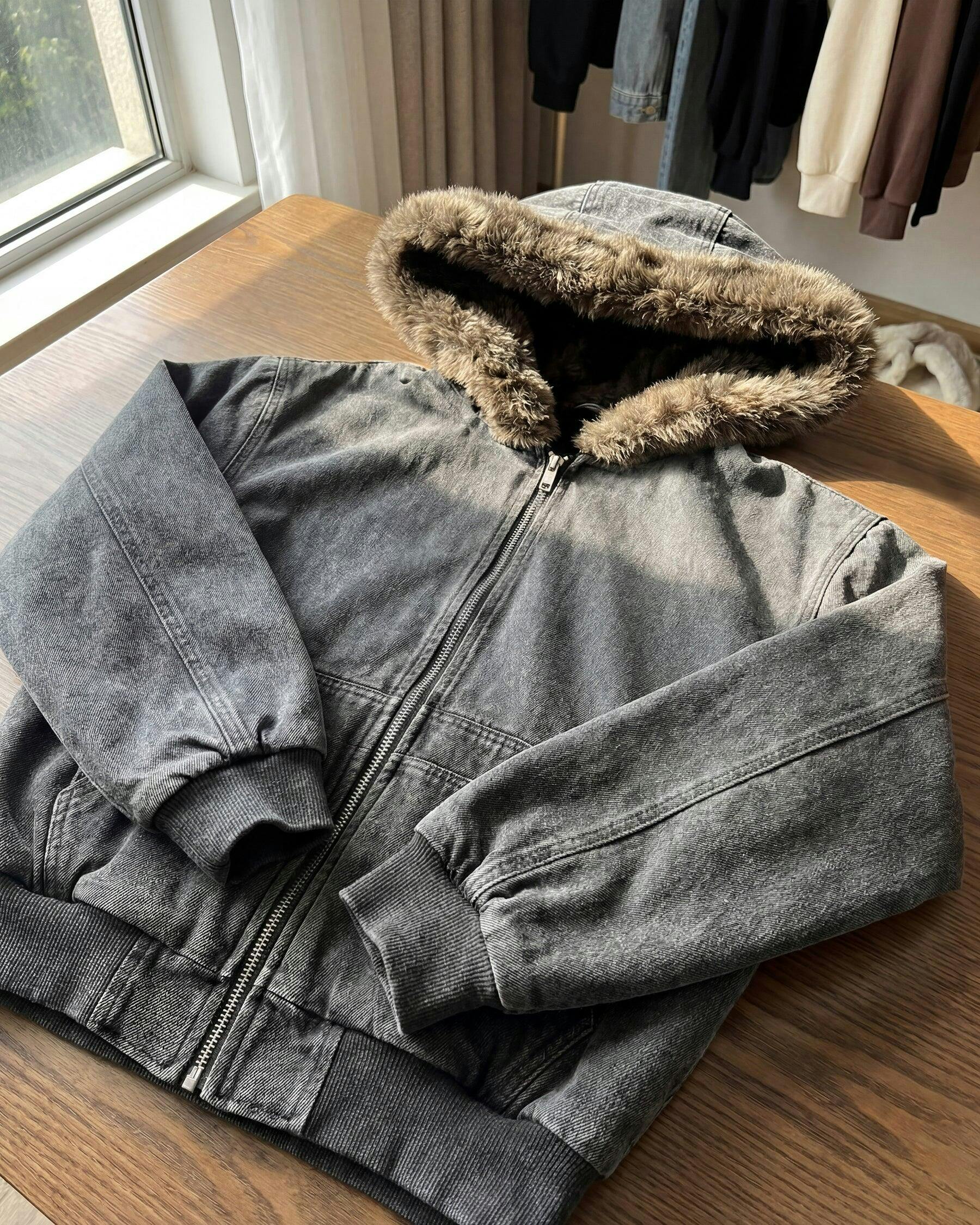 Features a hood trimmed with plush faux shearling, creating a play of contrasting materials.