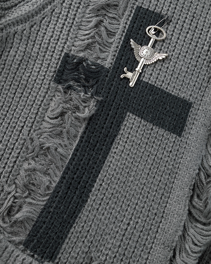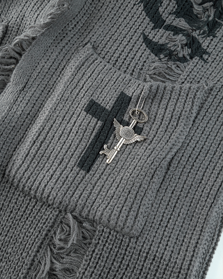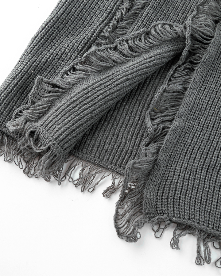 Design Elements: Distressed edges, long silhouette, open-front design, patch pockets