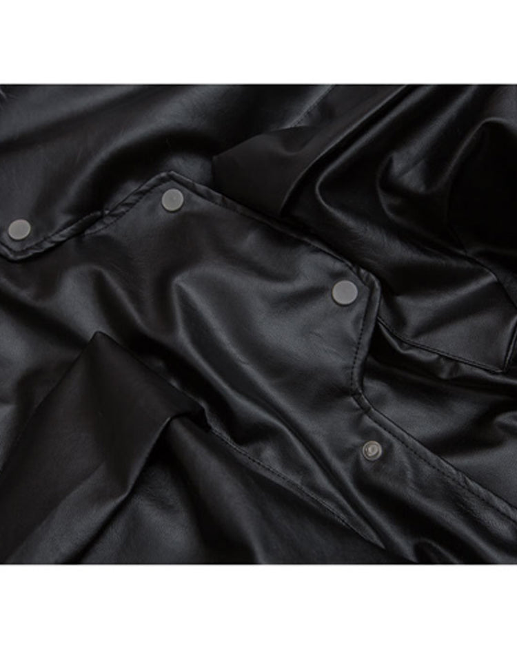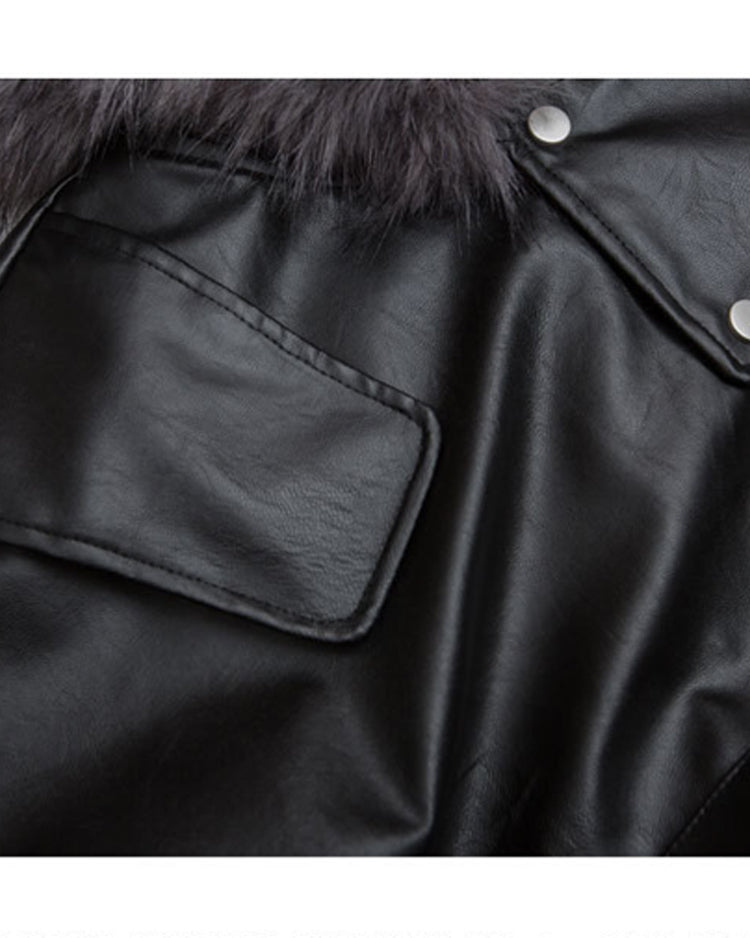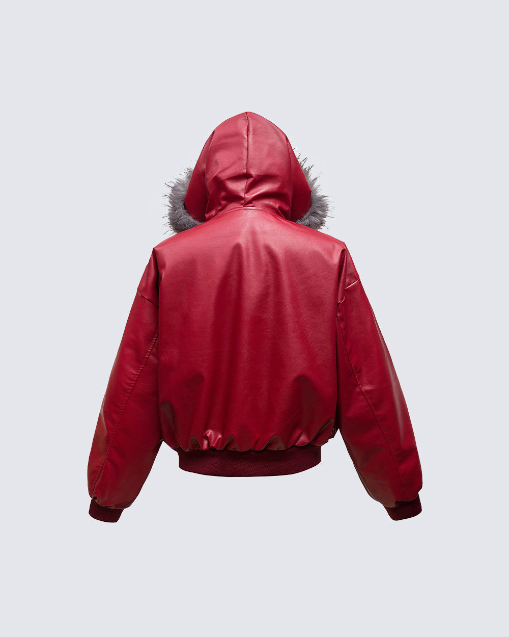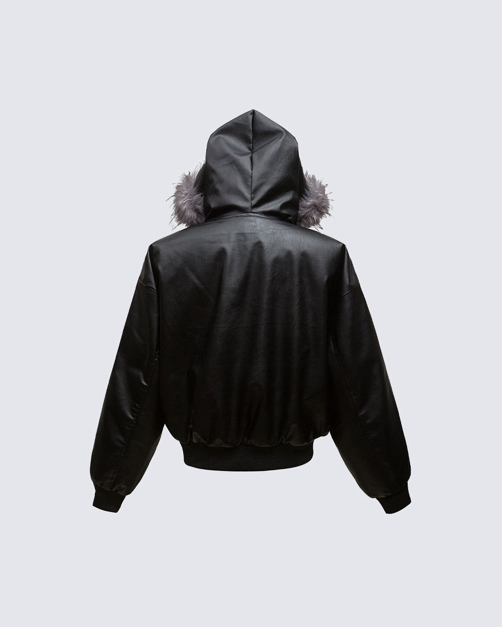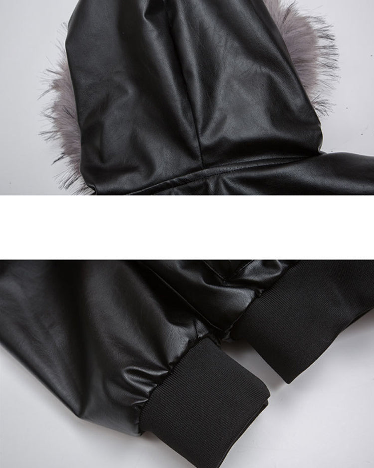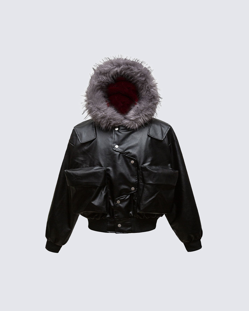 Large faux fur collar, hooded design, PU leather texture, zip-up front, padded interior, ribbed cuffs and hem, relaxed fit, warm and stylish retro street aesthetic