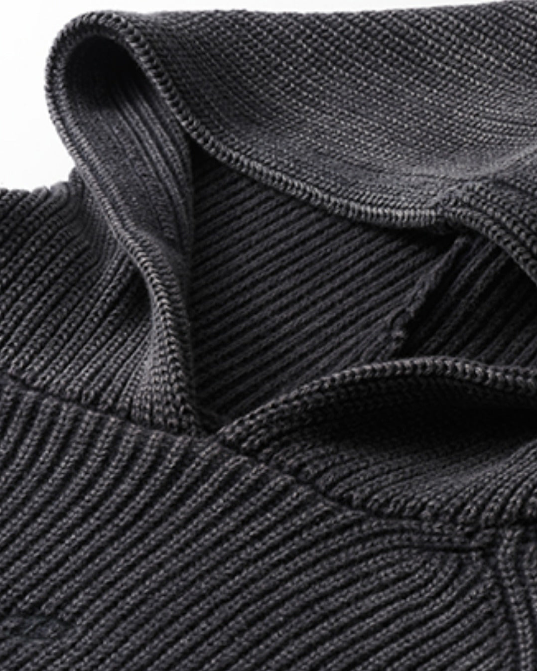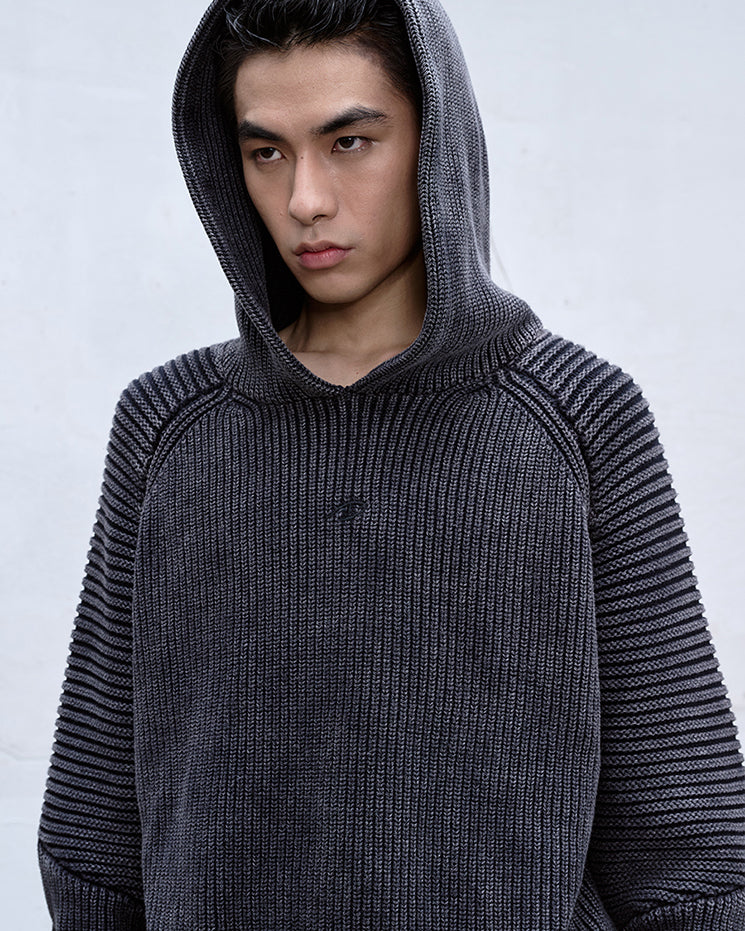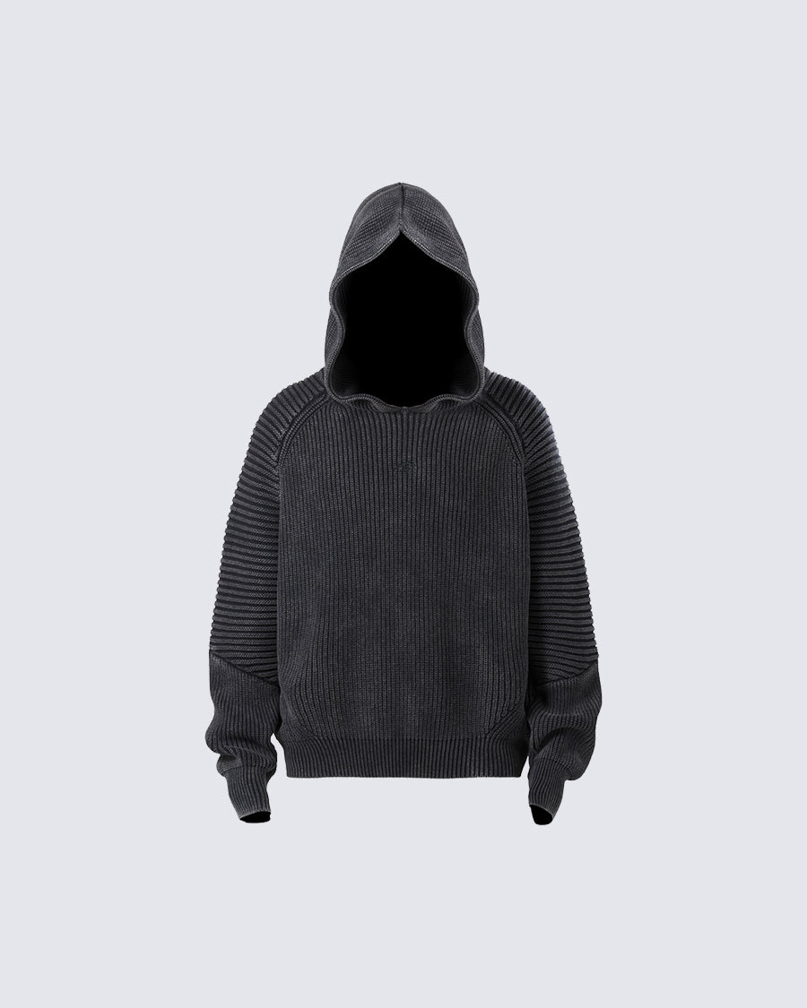 Design Elements: Ribbed heavy-knit texture, hooded pullover style, structured sleeves with ribbed detailing, relaxed fit, minimalist modern aesthetic