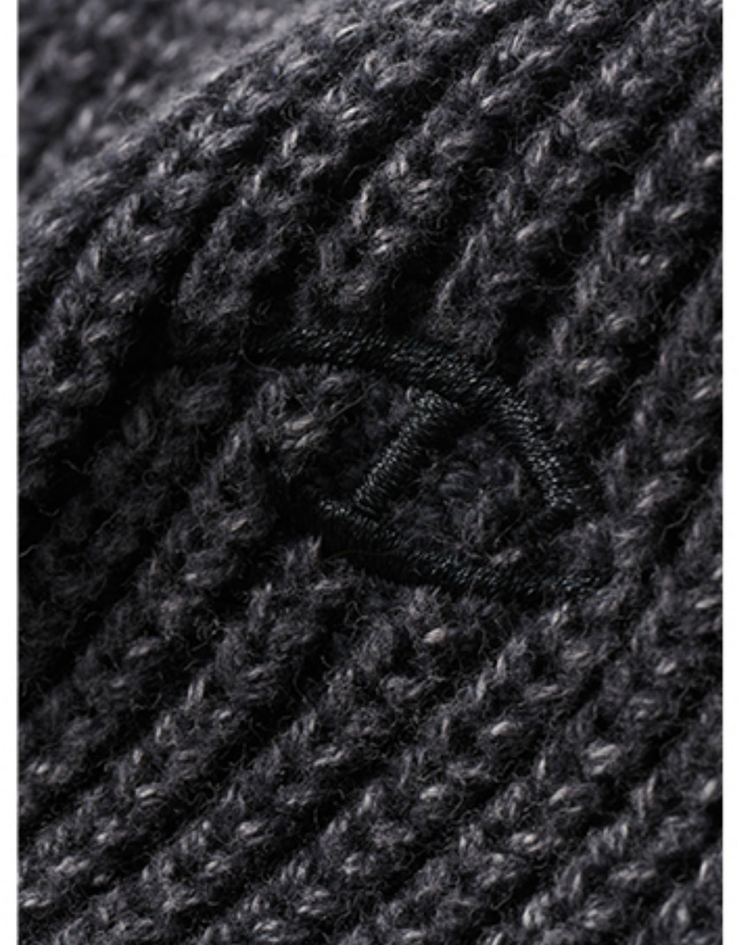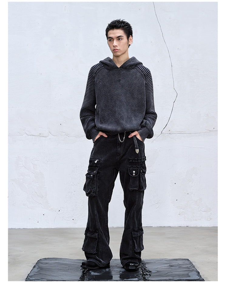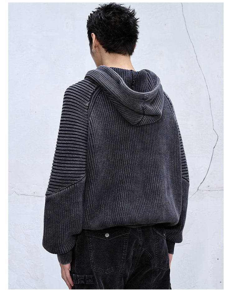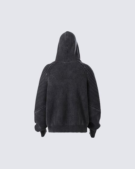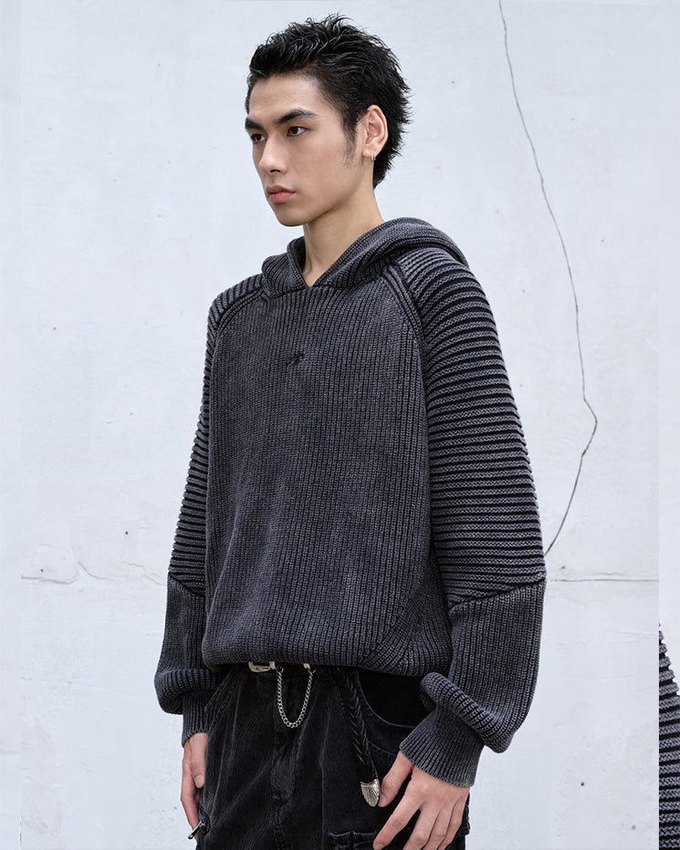 Design Elements: Ribbed heavy-knit texture, hooded pullover style, structured sleeves with ribbed detailing, relaxed fit, minimalist modern aesthetic