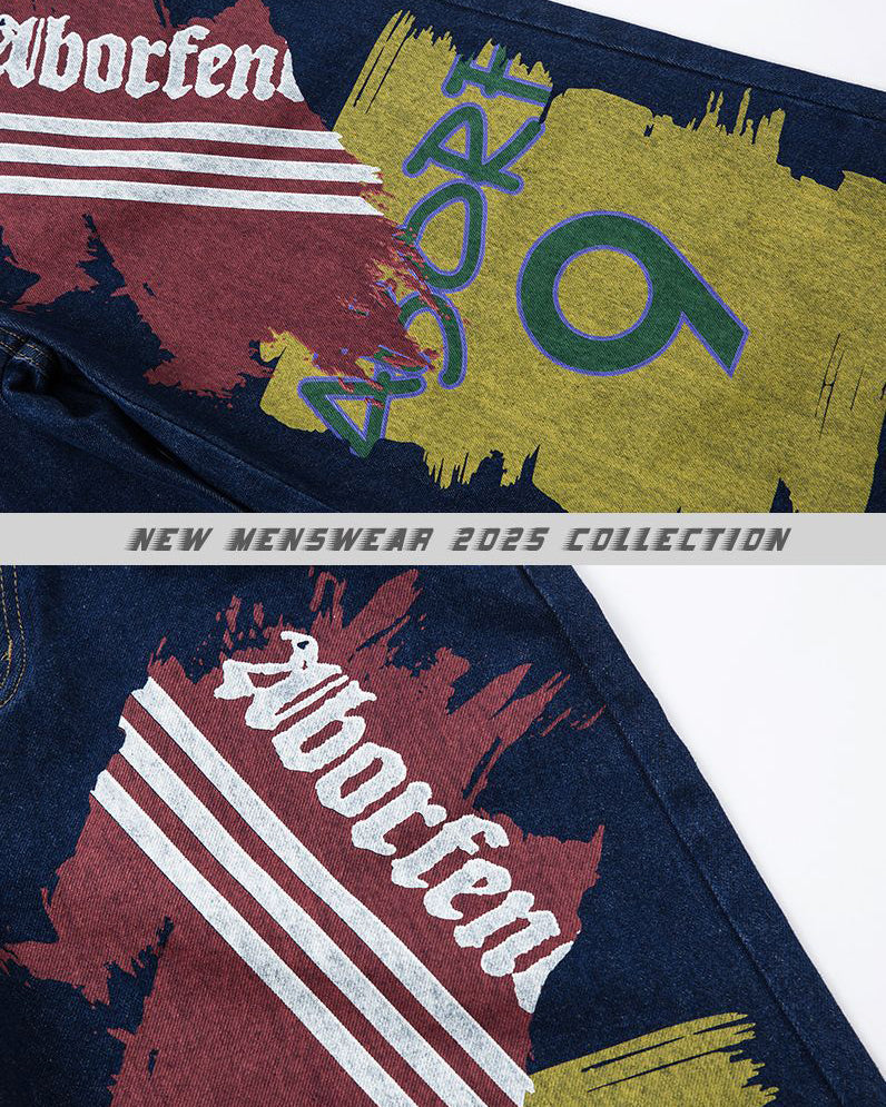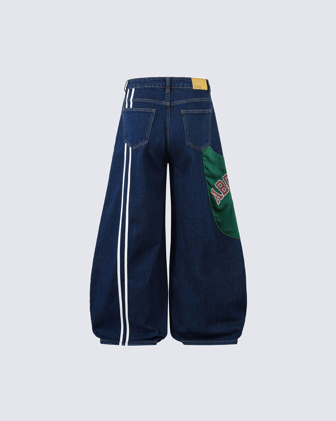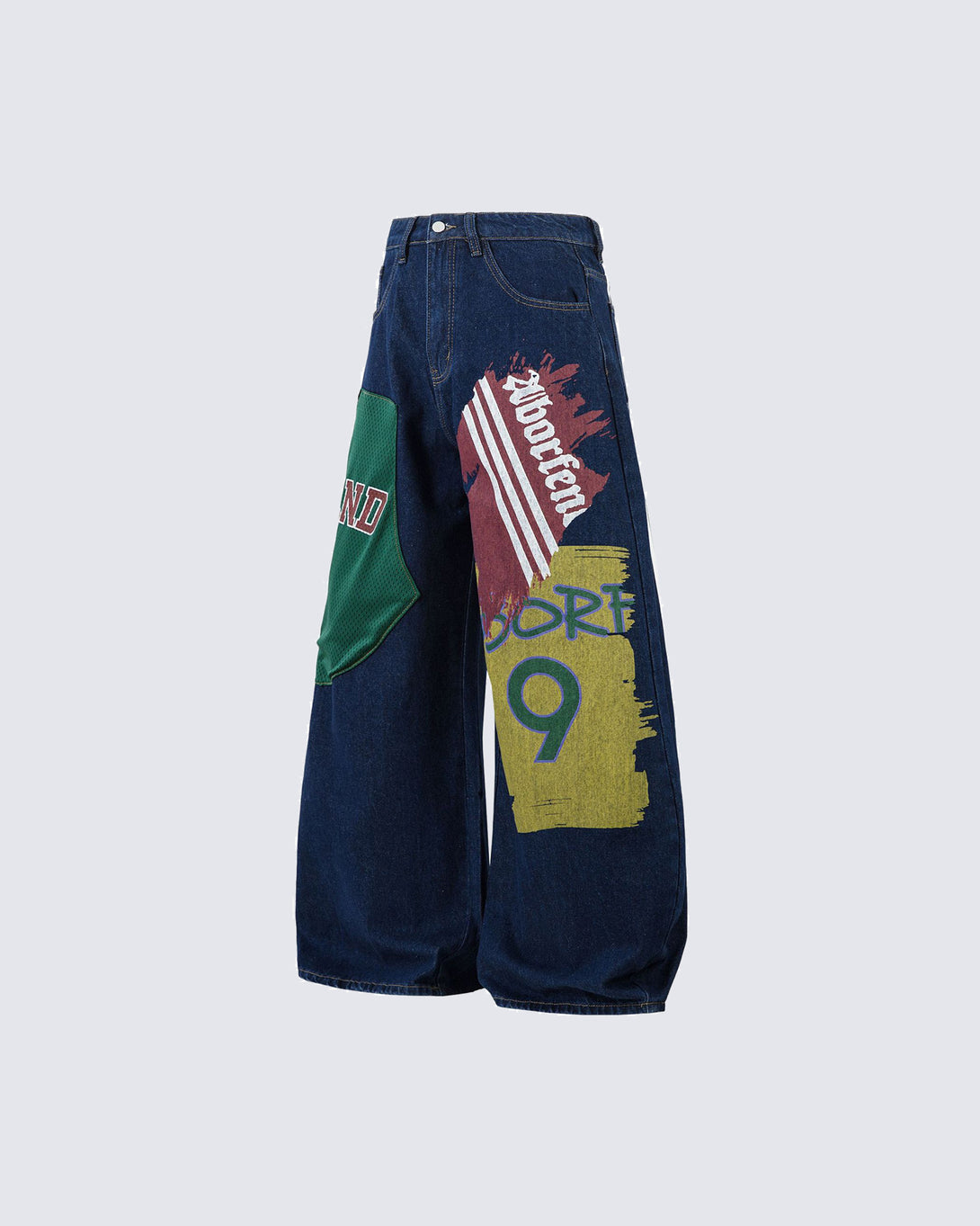 Colorful patchwork embroidery, contrast fabric appliqué, wide-leg silhouette, relaxed fit, classic five-pocket design, high-waist cut