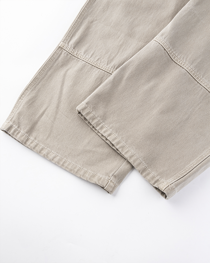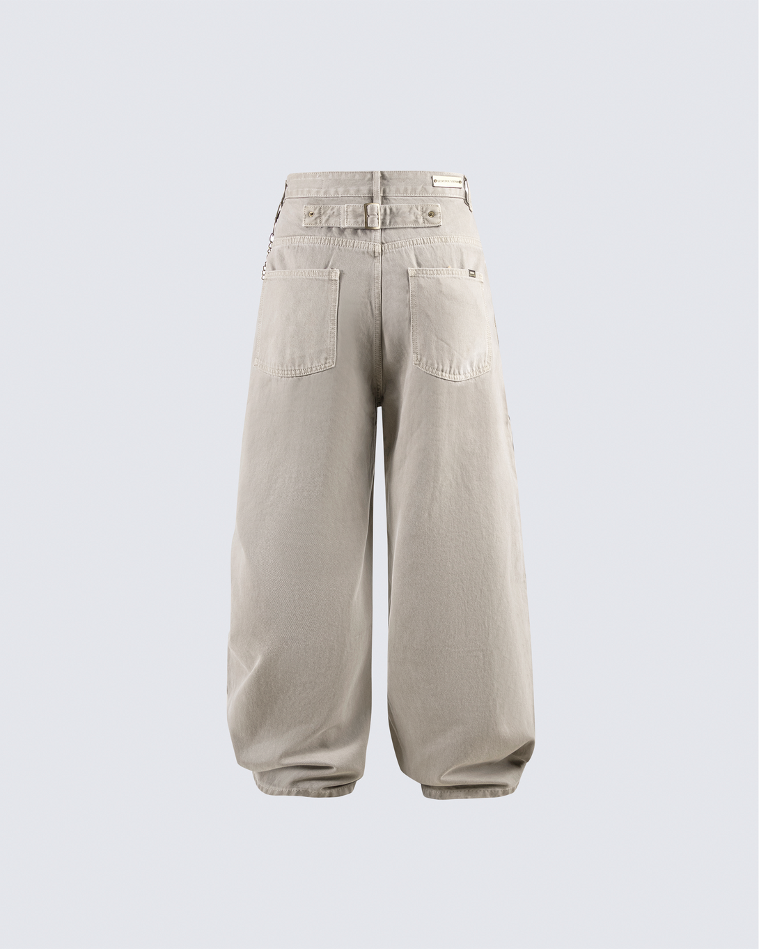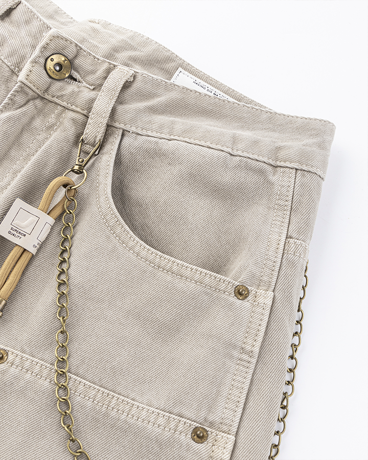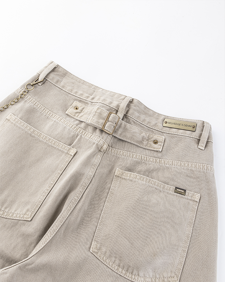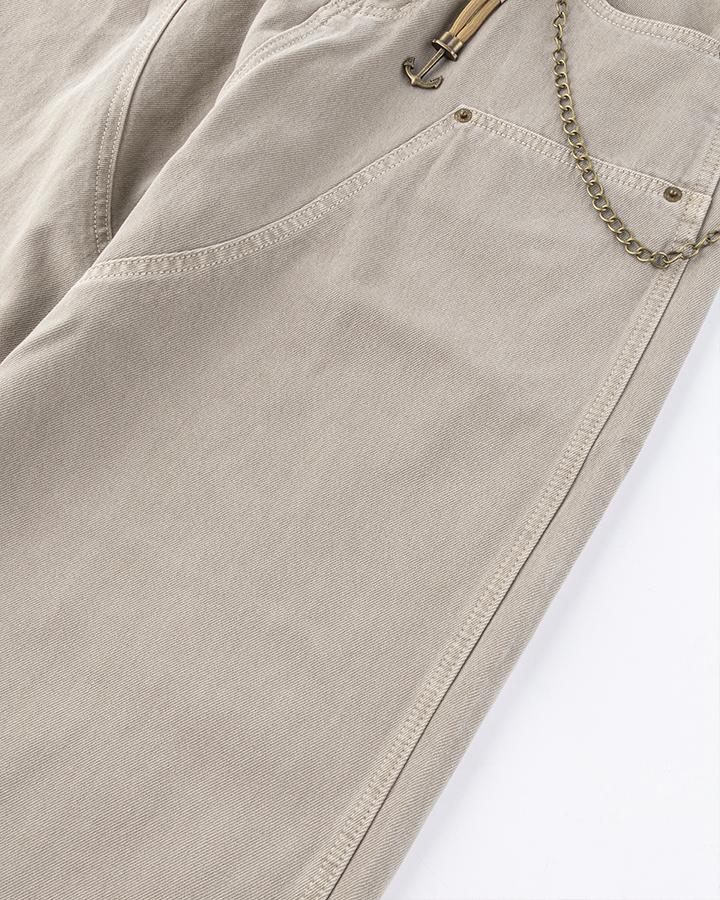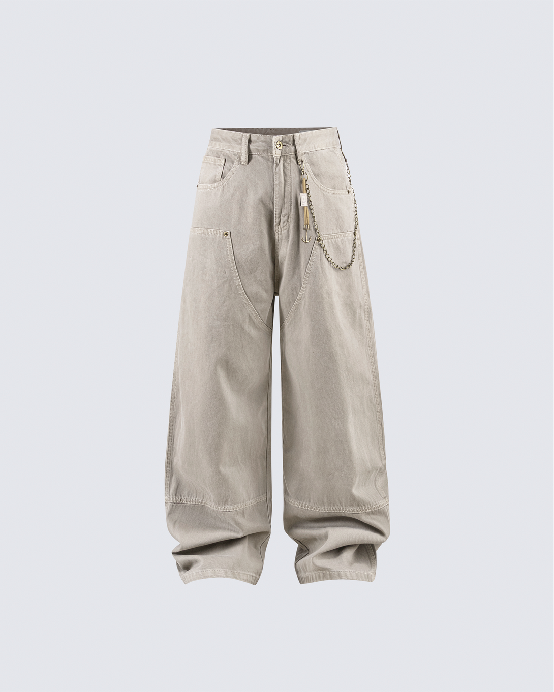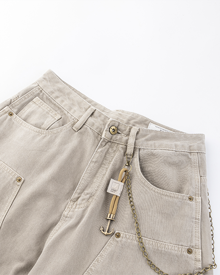 Design Elements: Wide-leg silhouette, oversized front patch pockets, metal chain accessory, front zip closure, relaxed drop-length hem