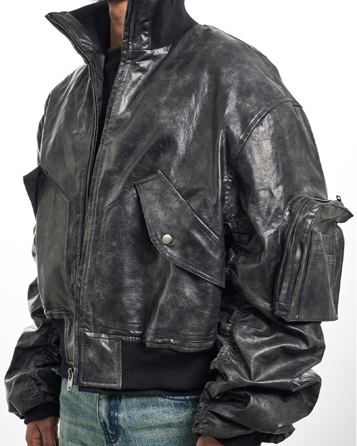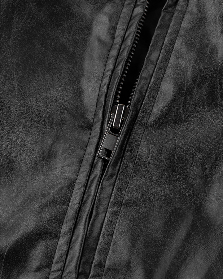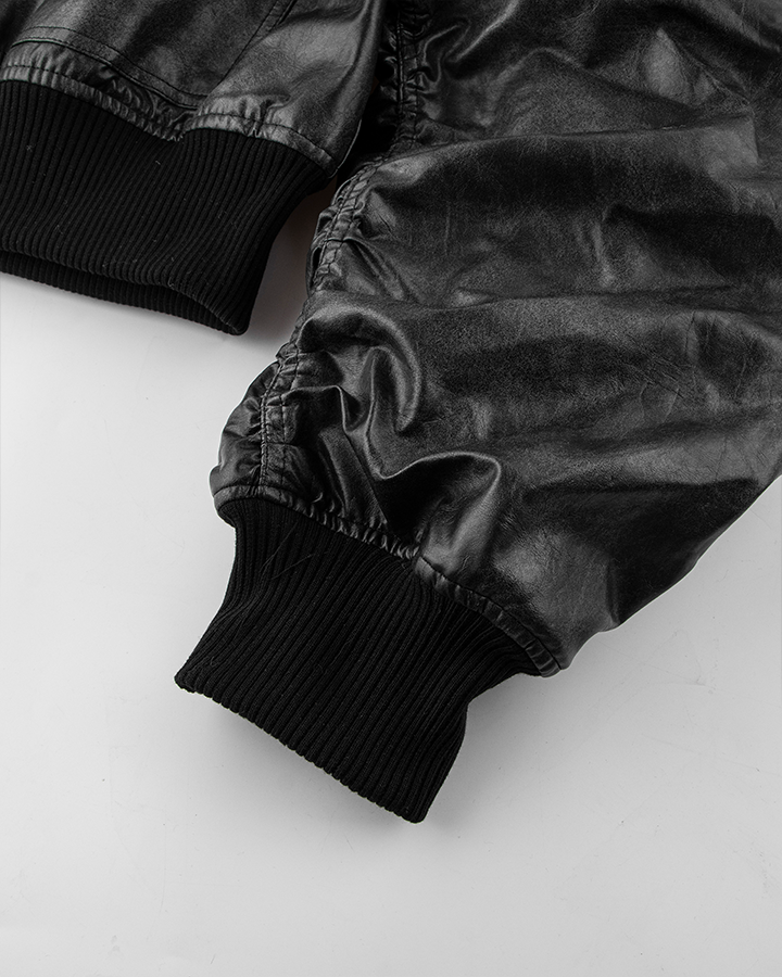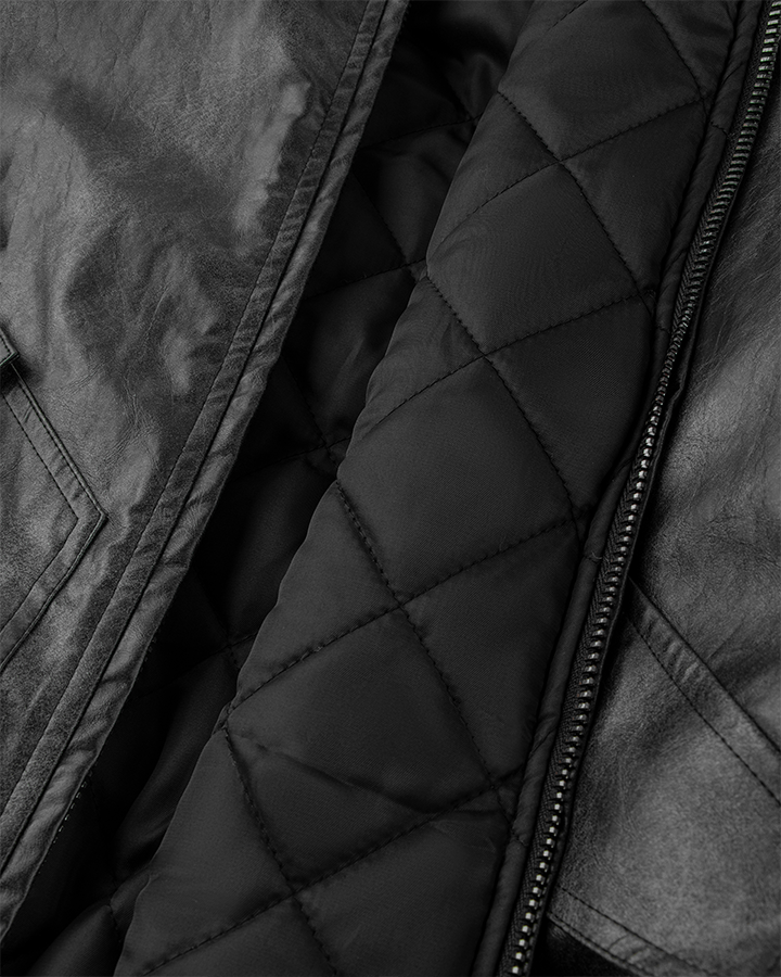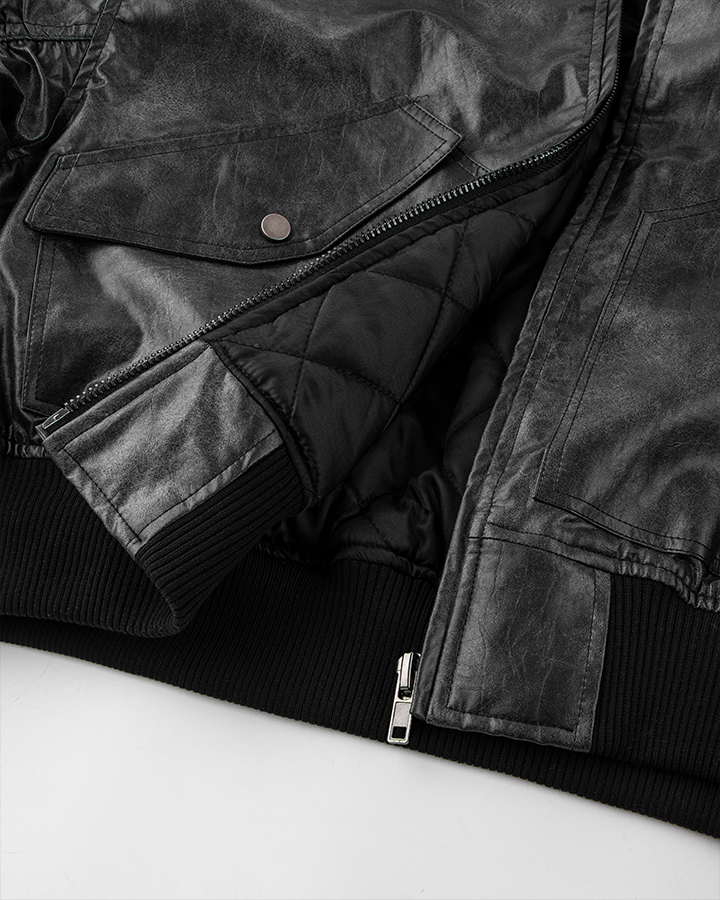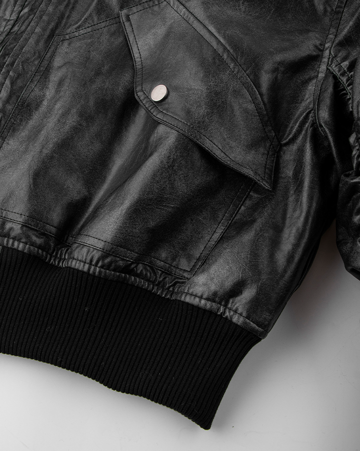 Design Elements: Vintage leather look, ruched sleeve details, ribbed collar and cuffs, front flap pockets, insulated inner padding for warmth