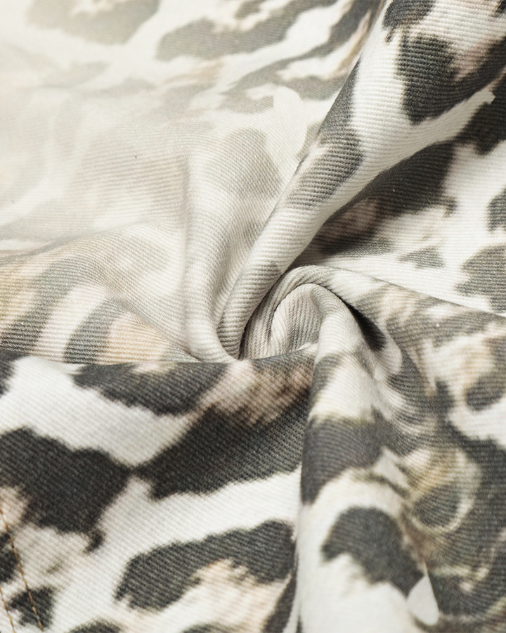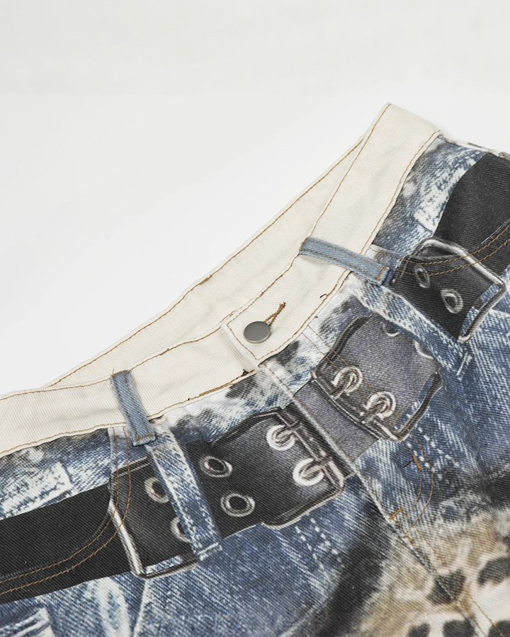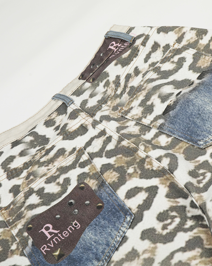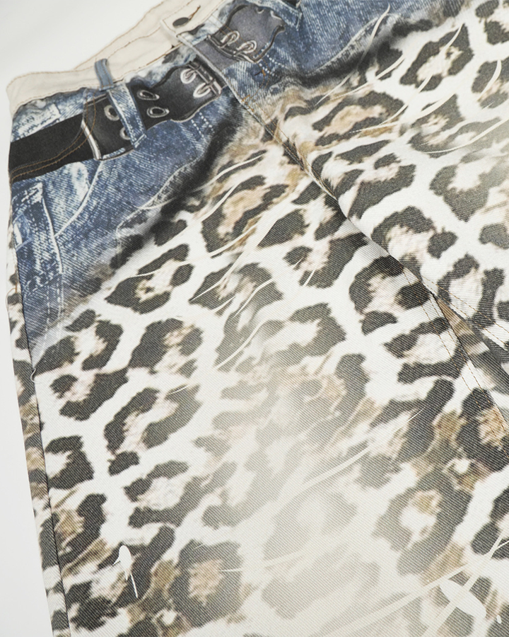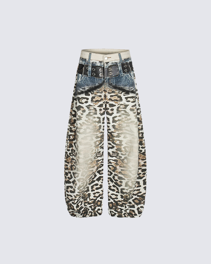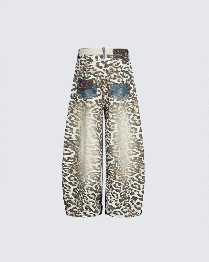 Design Elements: These wide-leg jeans feature a bold leopard print throughout, with a unique denim waistband and faux denim pockets. The mix of animal print and denim details creates a stylish and contemporary design, perfect for making a fashion statement.