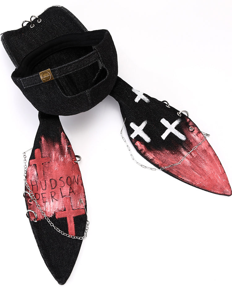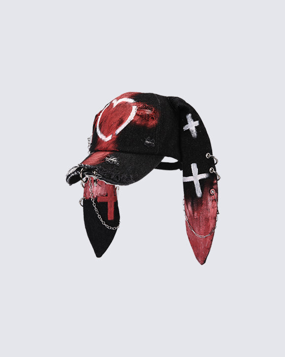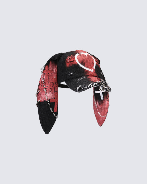 Design Elements: Bunny ear design, graffiti-style print, heart and cross motifs, metal chain and ring embellishments, distressed punk aesthetic