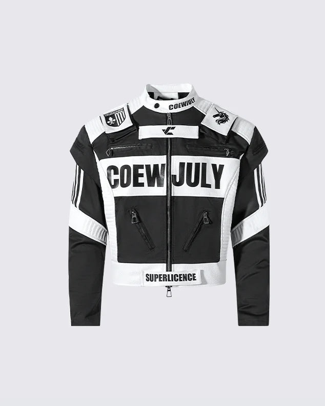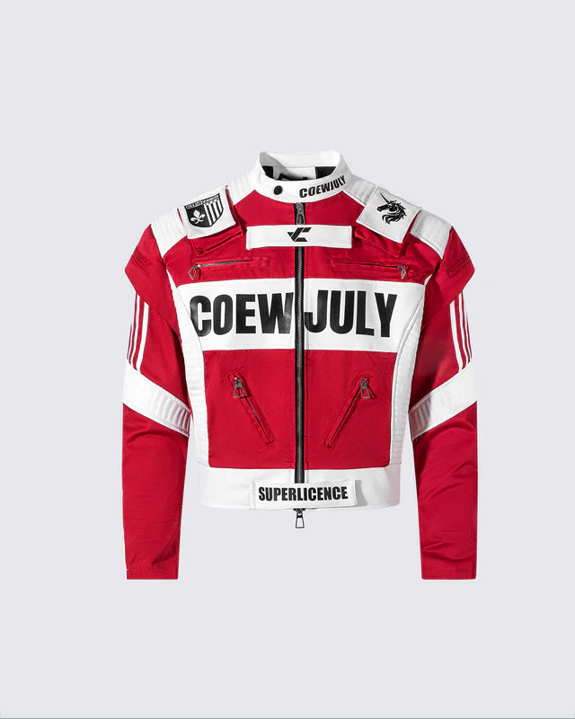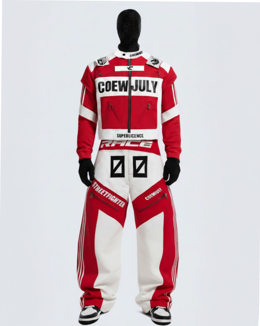 Scene: Streetwear, motorsport-inspired fashion, urban retro outfits, daily wear, seasonal styling