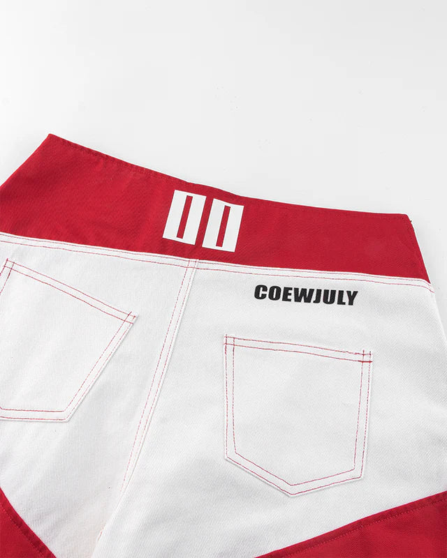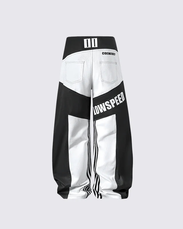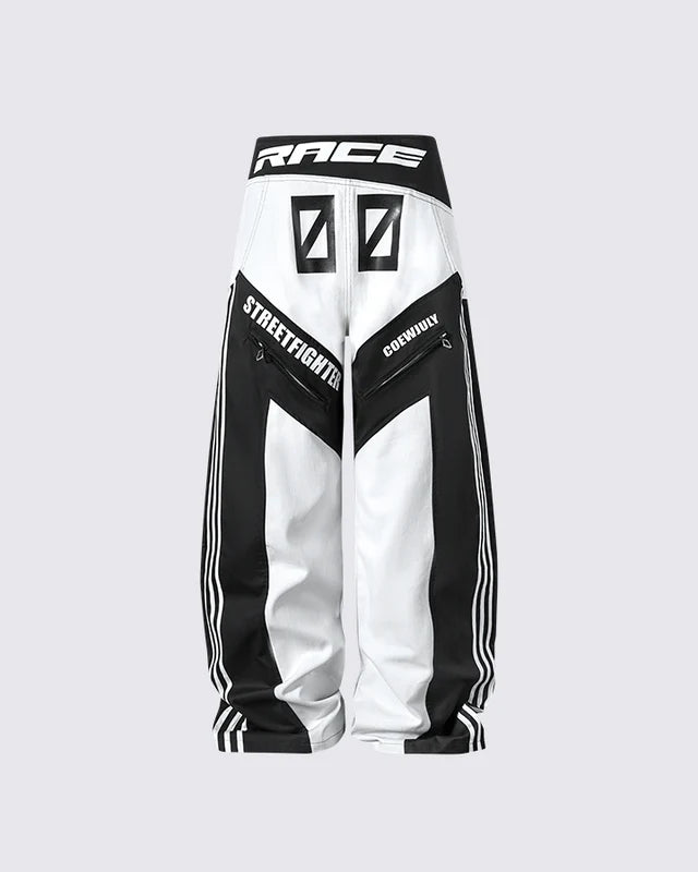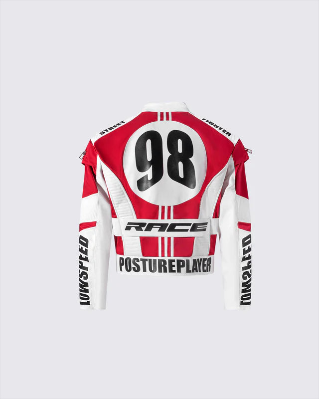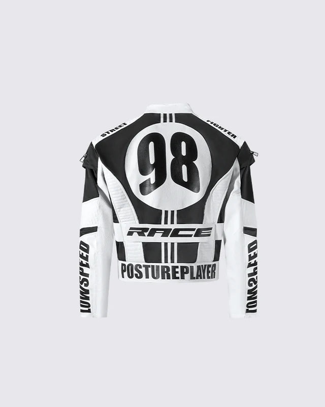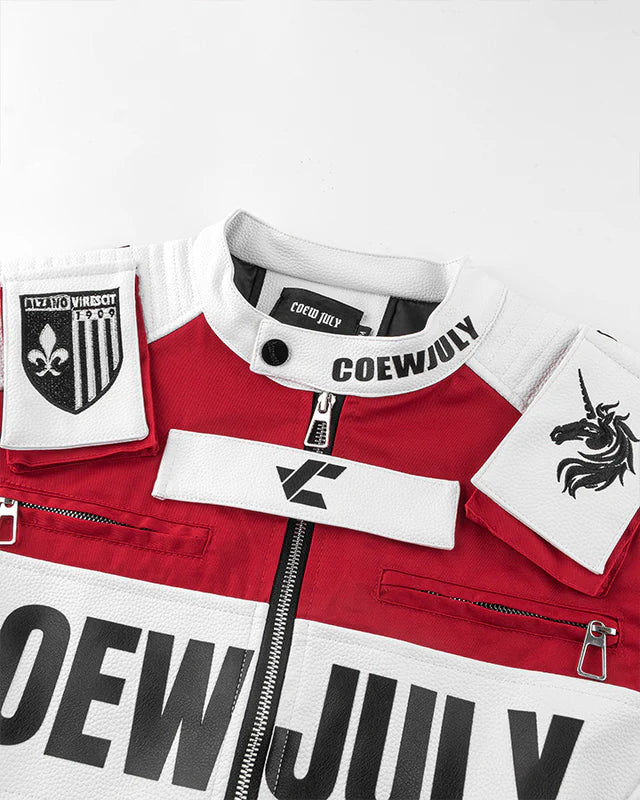 Design Elements: Racing graphics, PU leather panels, denim & canvas contrasts, bold color blocking, zip-up closure, sporty silhouette, street-retro vibe