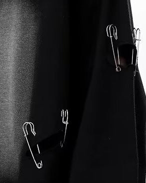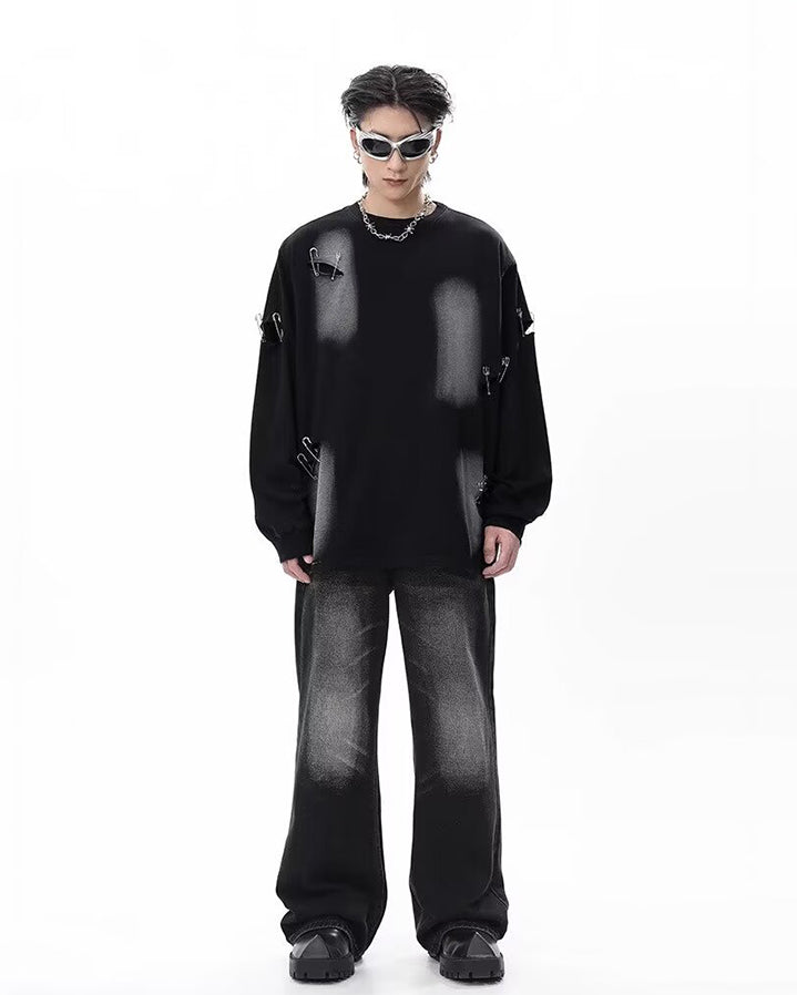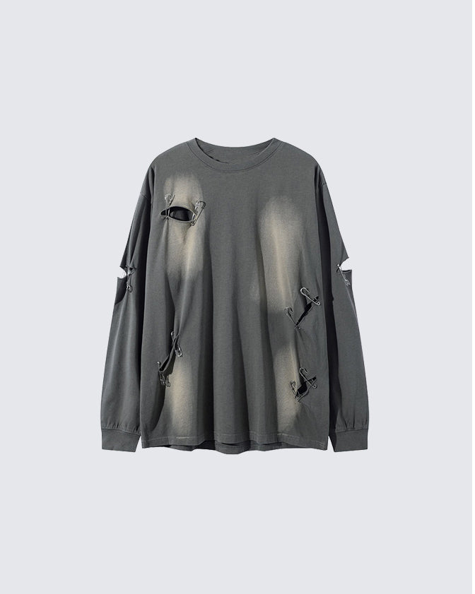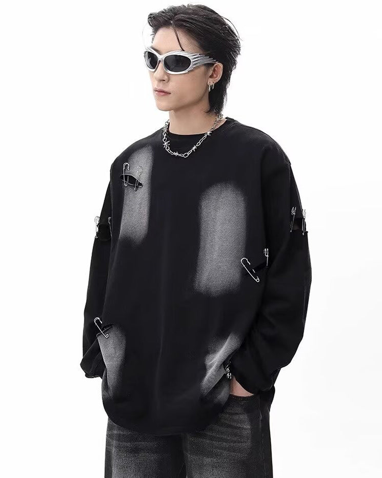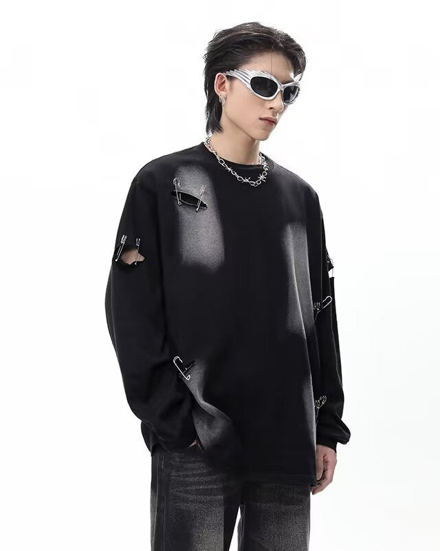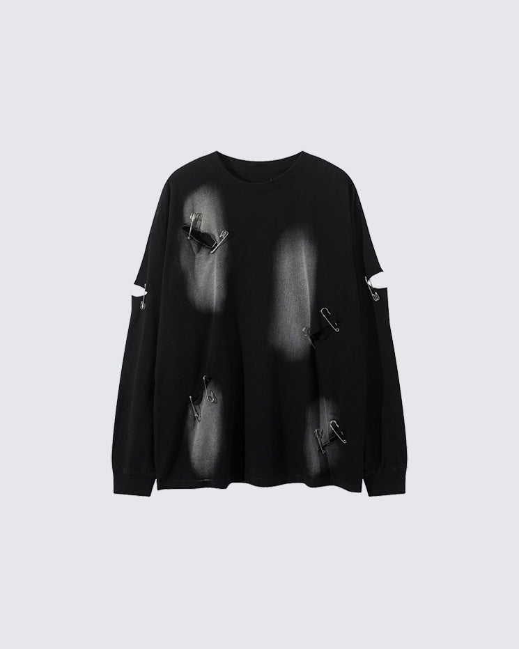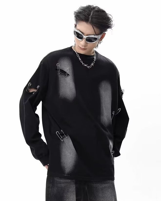 Distressed holes with safety pin embellishments, crewneck, long sleeves, washed fade effect, relaxed loose fit