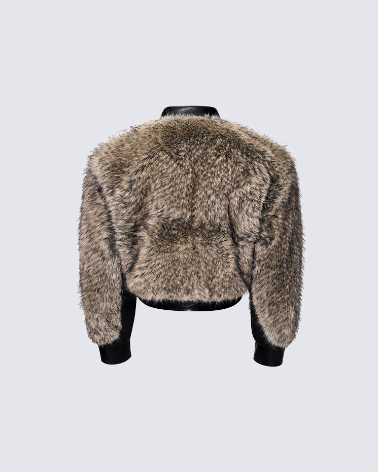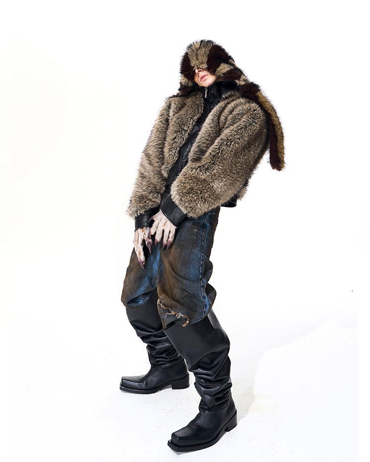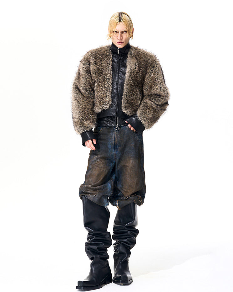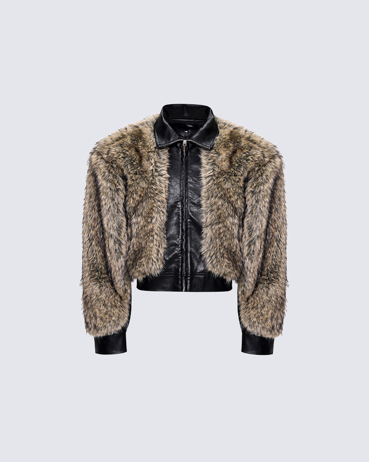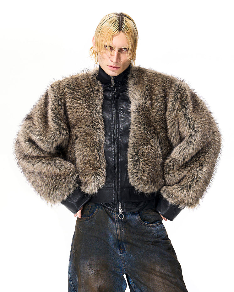 Faux fur and leather patchwork design, zip-up front, cropped silhouette, structured collar, bold contrast texture