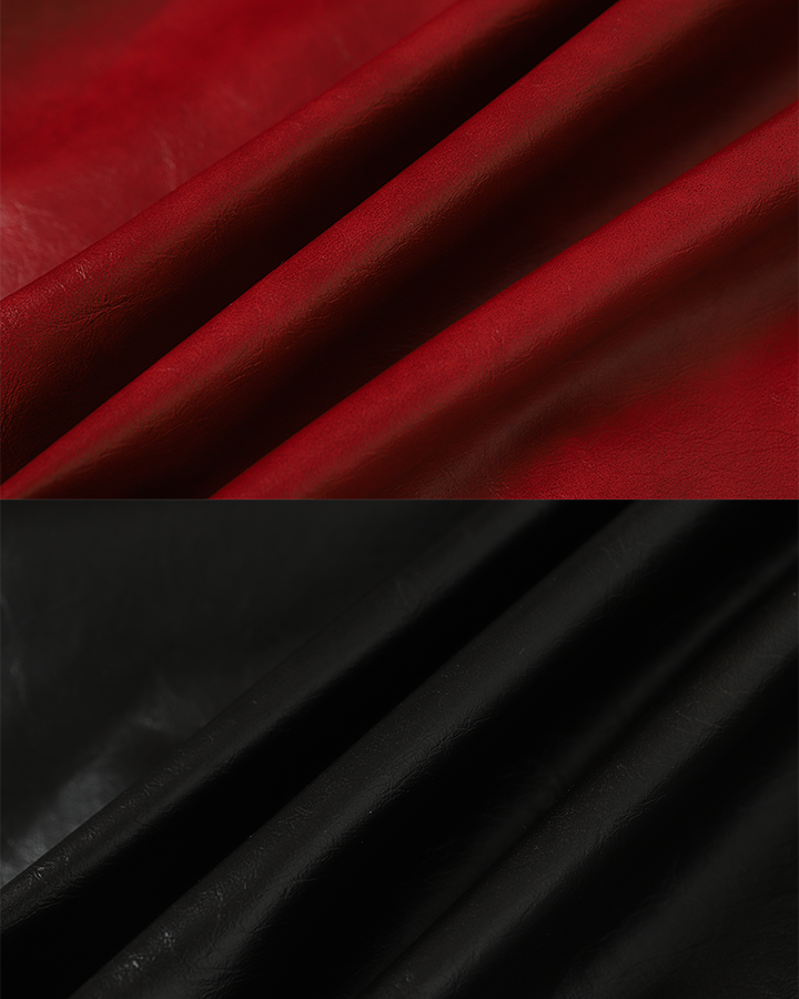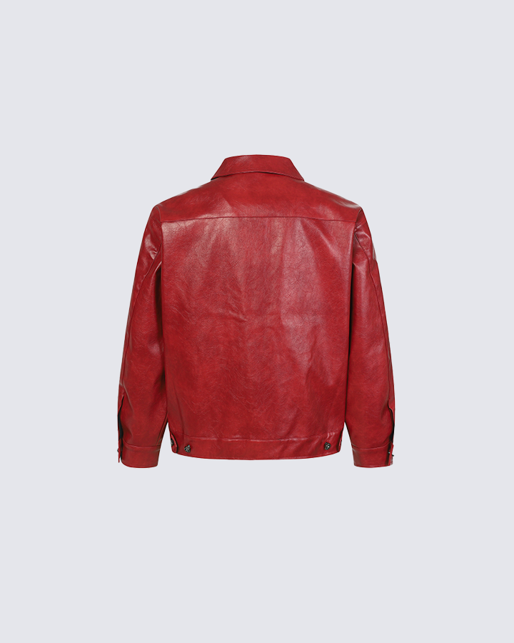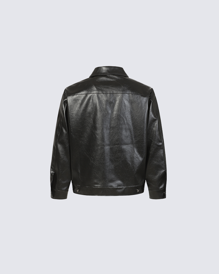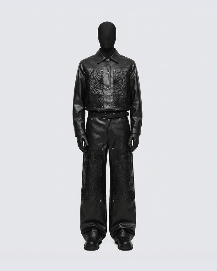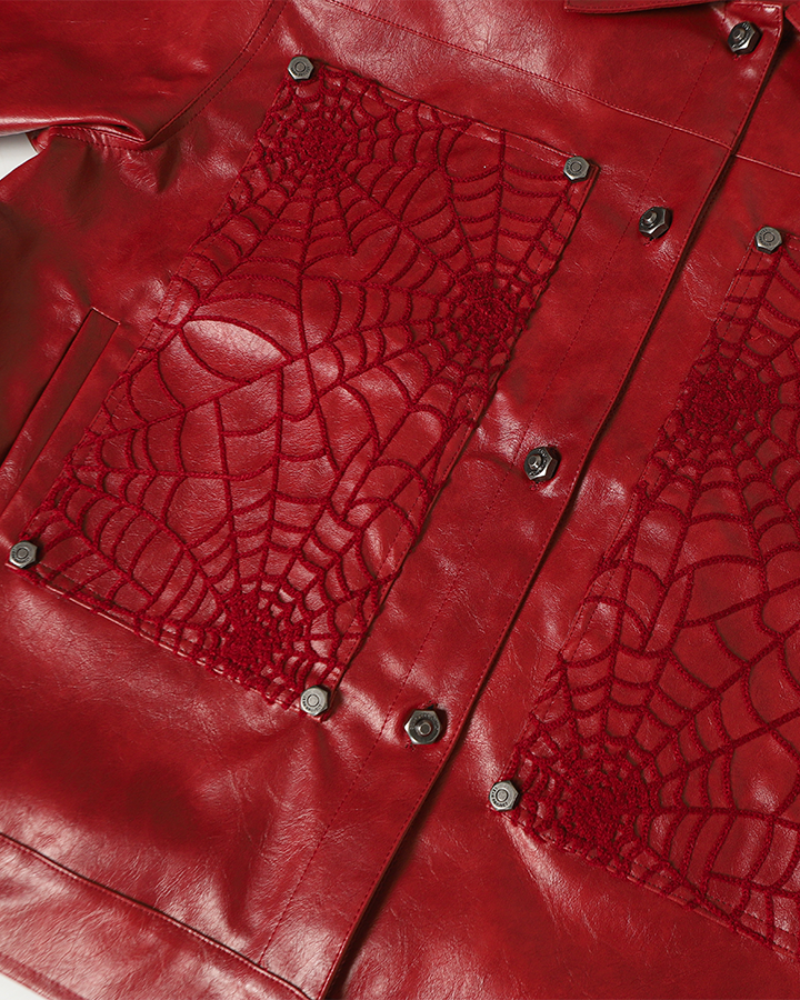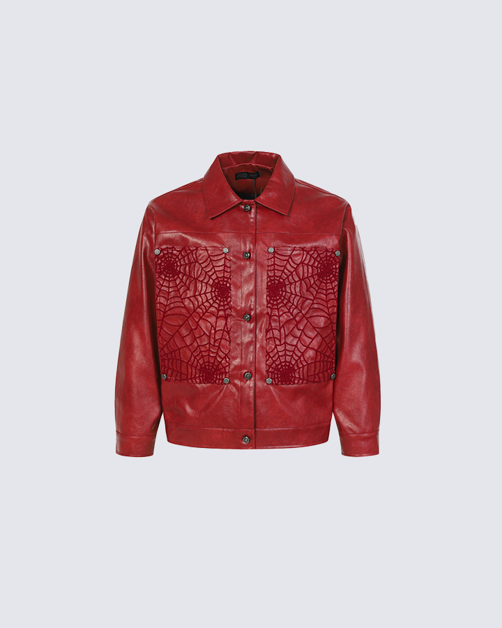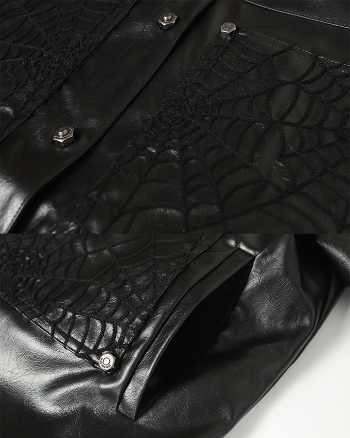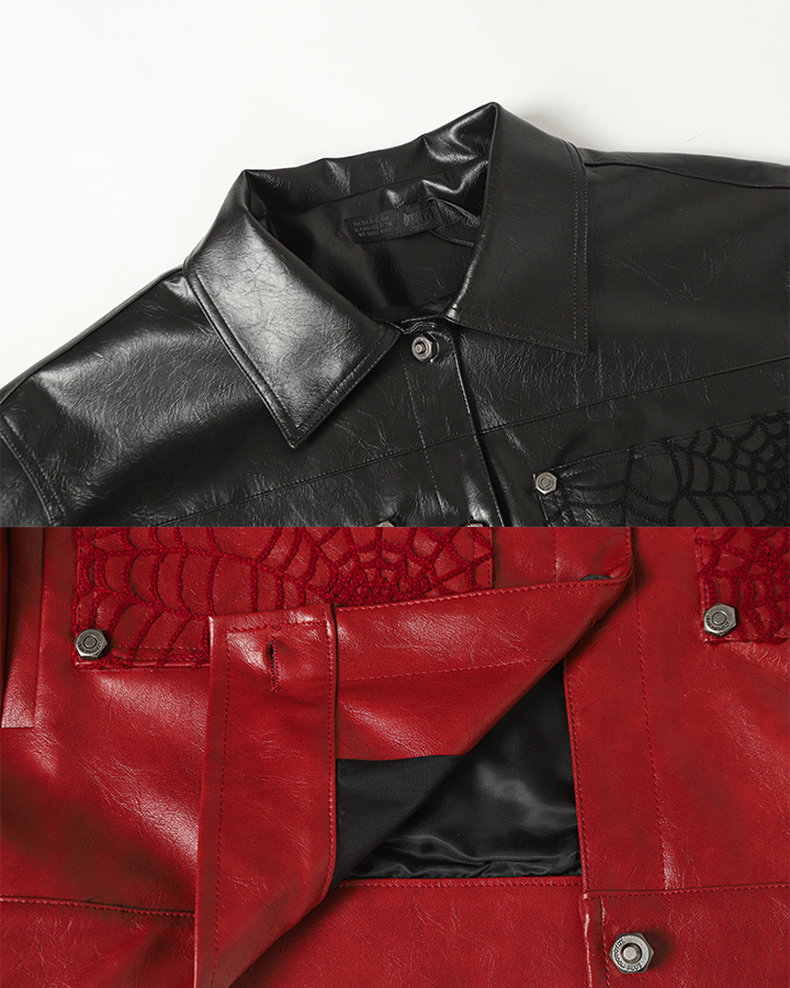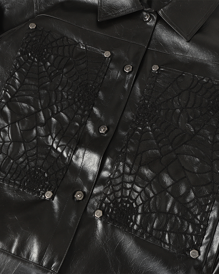 Design Elements: Button-up closure, structured faux leather exterior, spiderweb-embossed front panels, shirt-style collar, adjustable hem tabs, straight silhouette