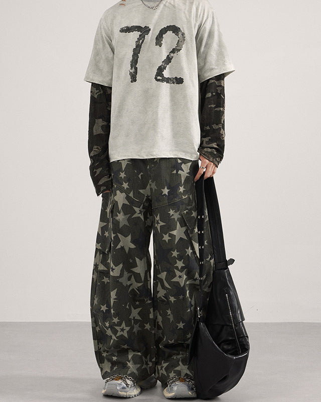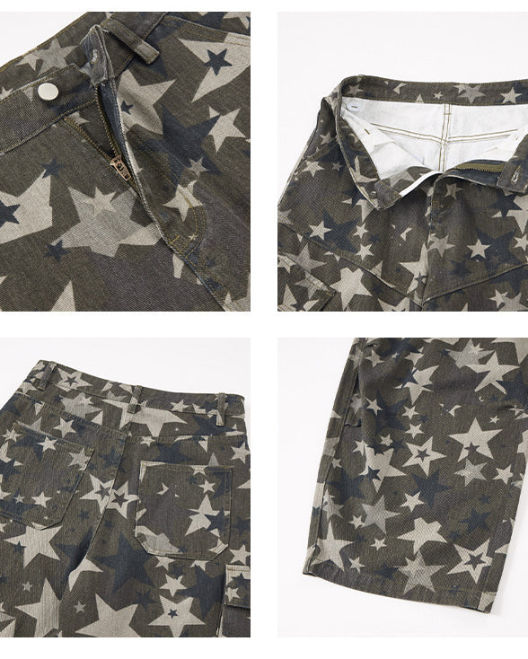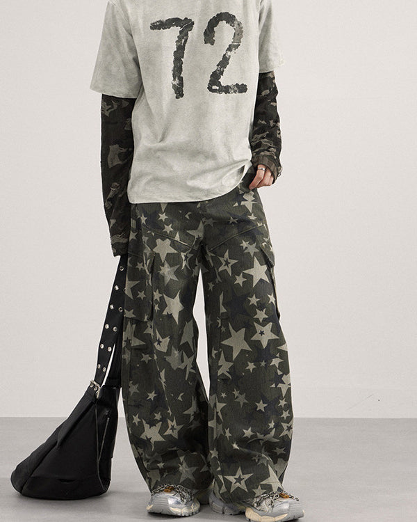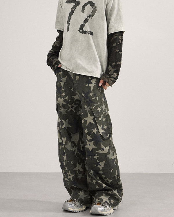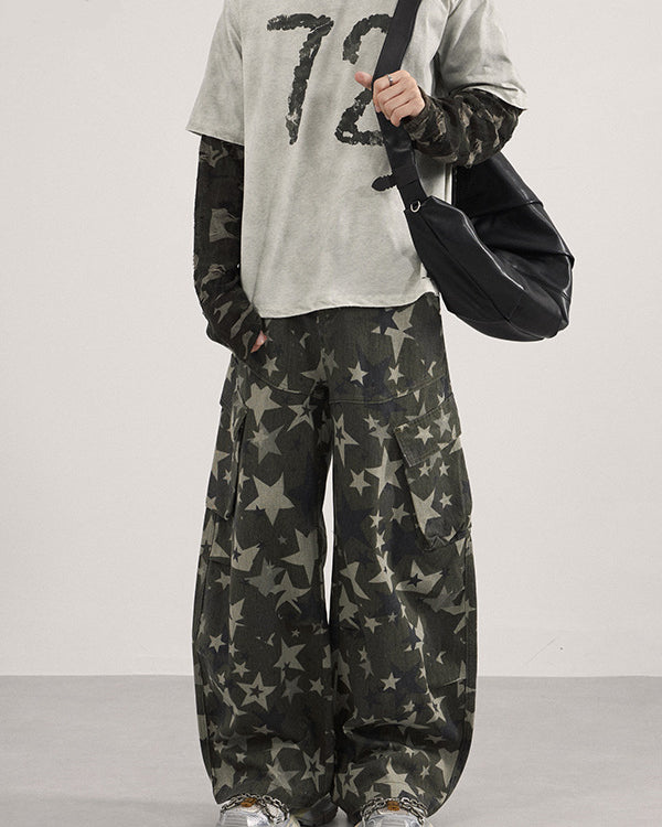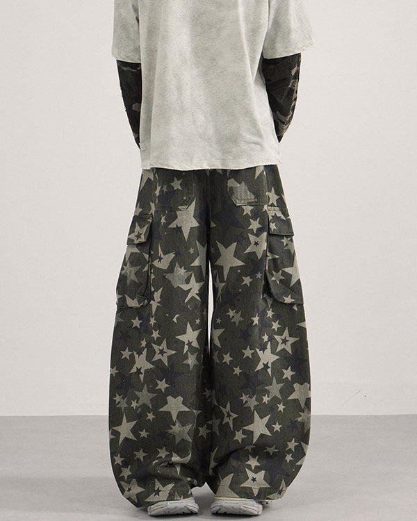 Design Elements: All-over star print, wide-leg silhouette, cargo pockets, relaxed fit, bold street style