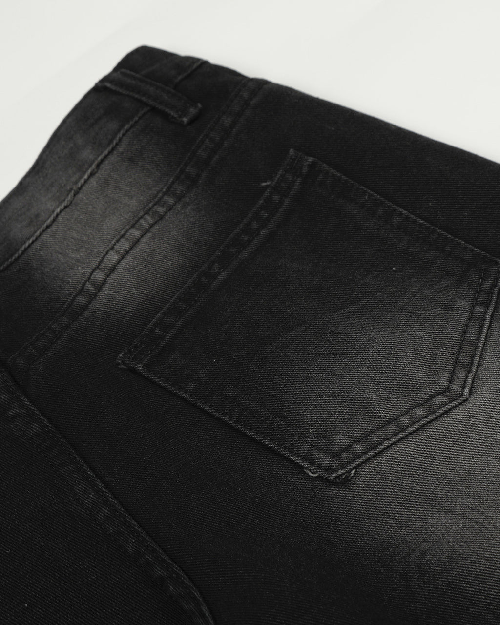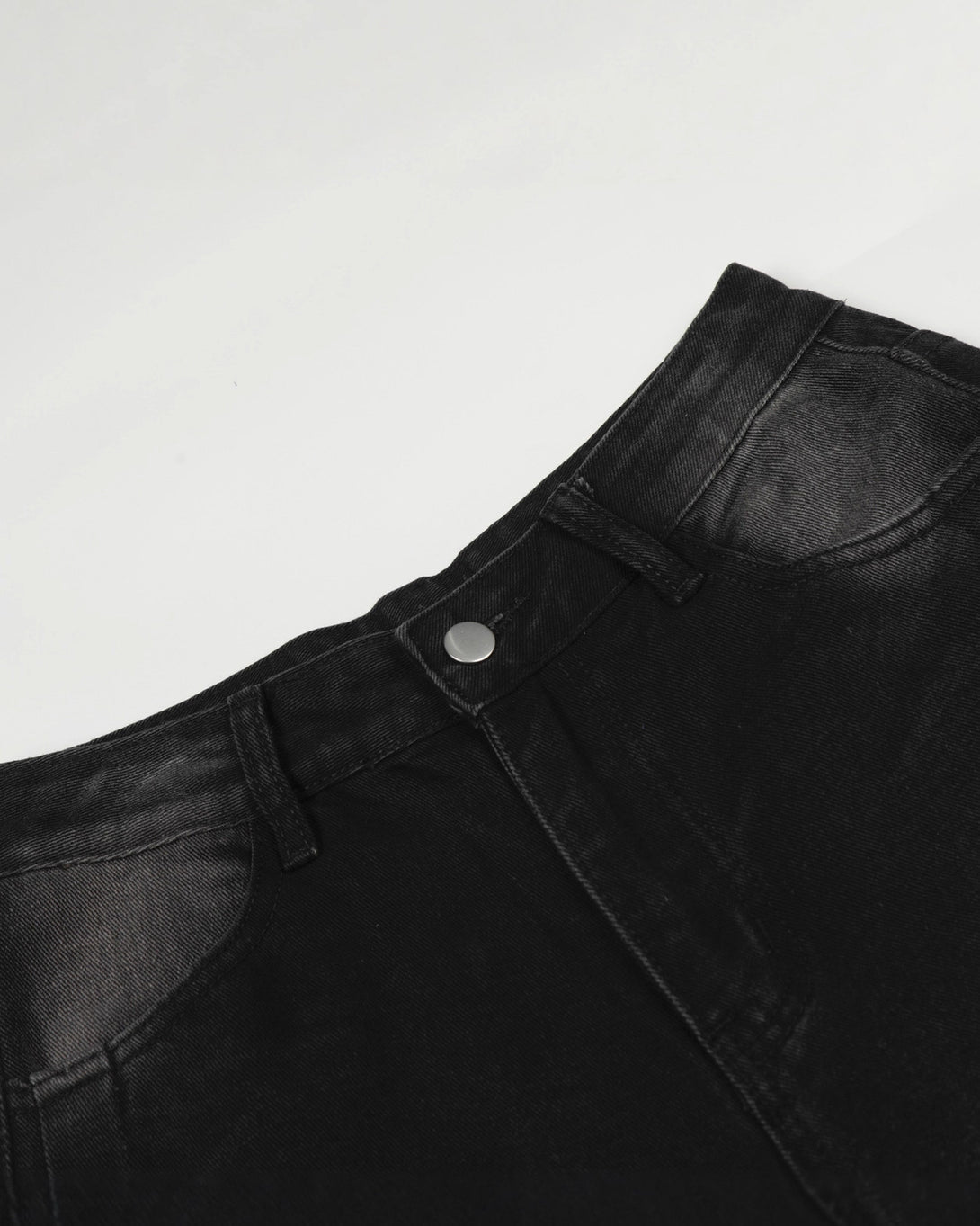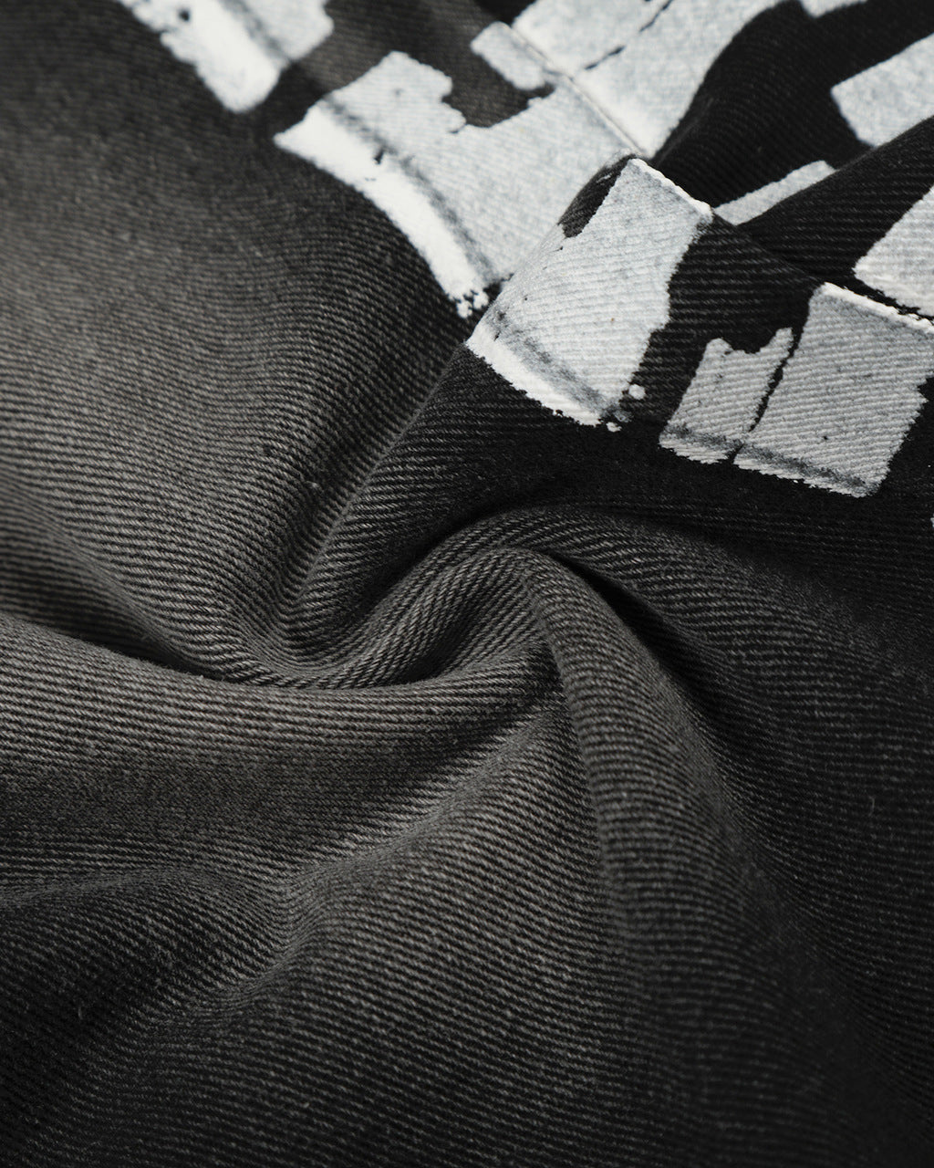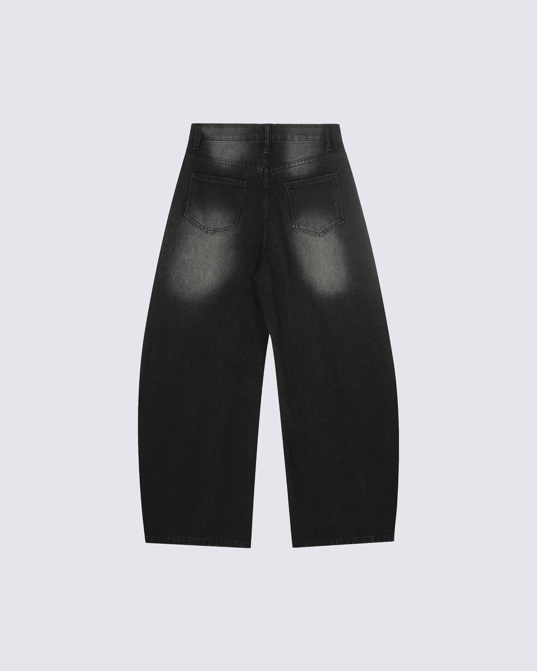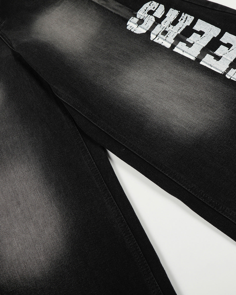 Curved wide-leg silhouette, washed fade effect, printed lettering detail, relaxed fit, high-waist cut