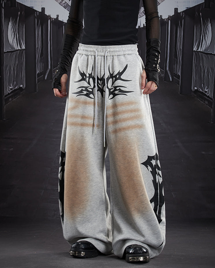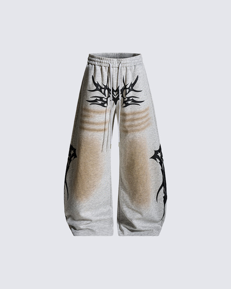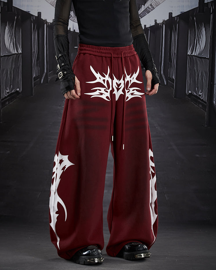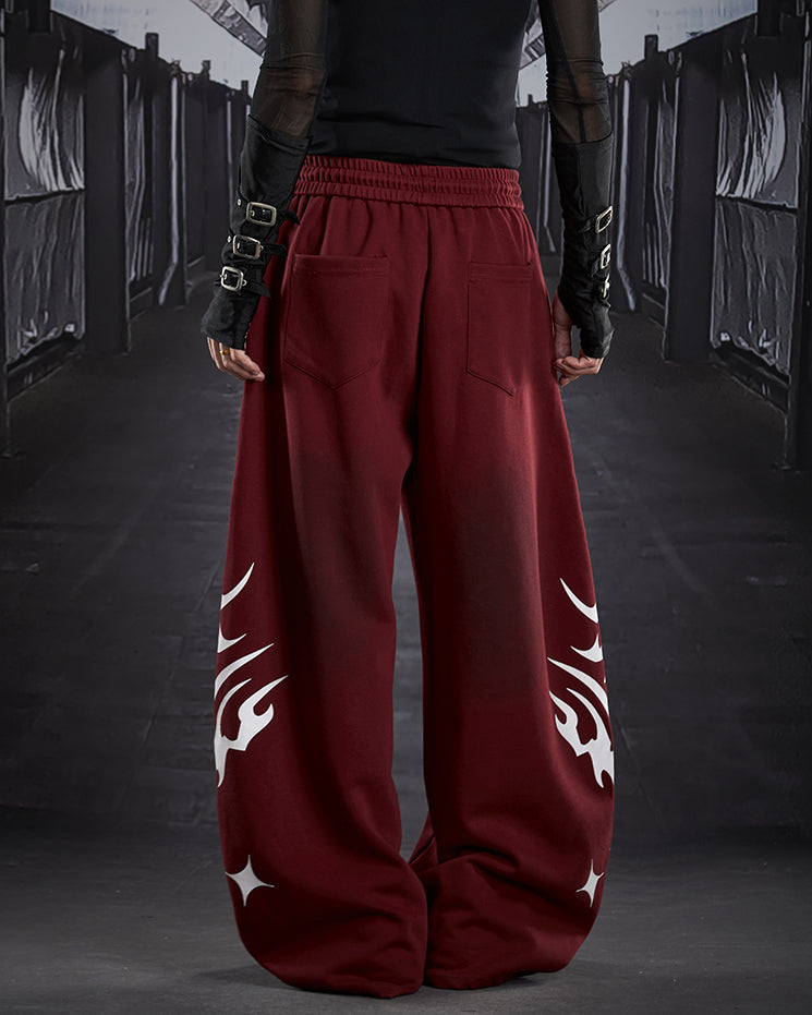 Flame print graphic on front and sides, elastic drawstring waistband, oversized wide-leg silhouette, and soft brushed fabric for comfort.