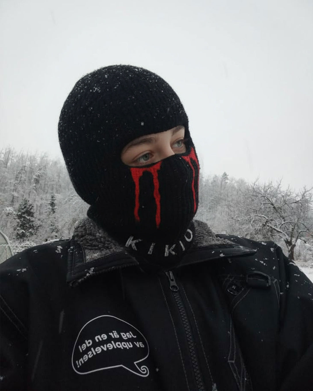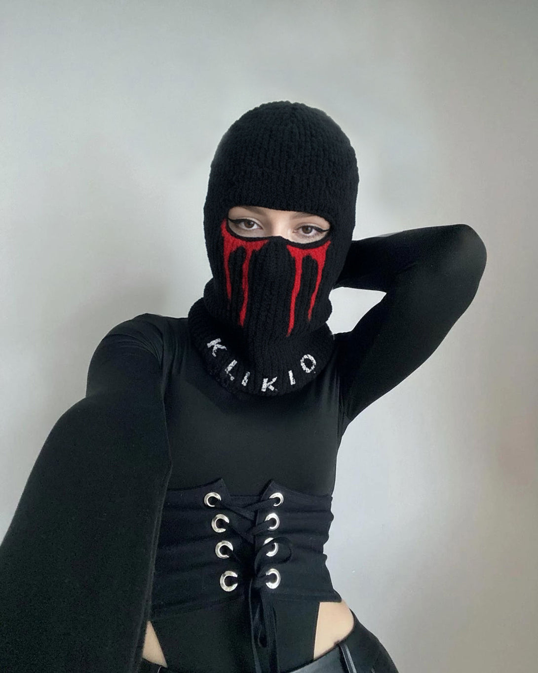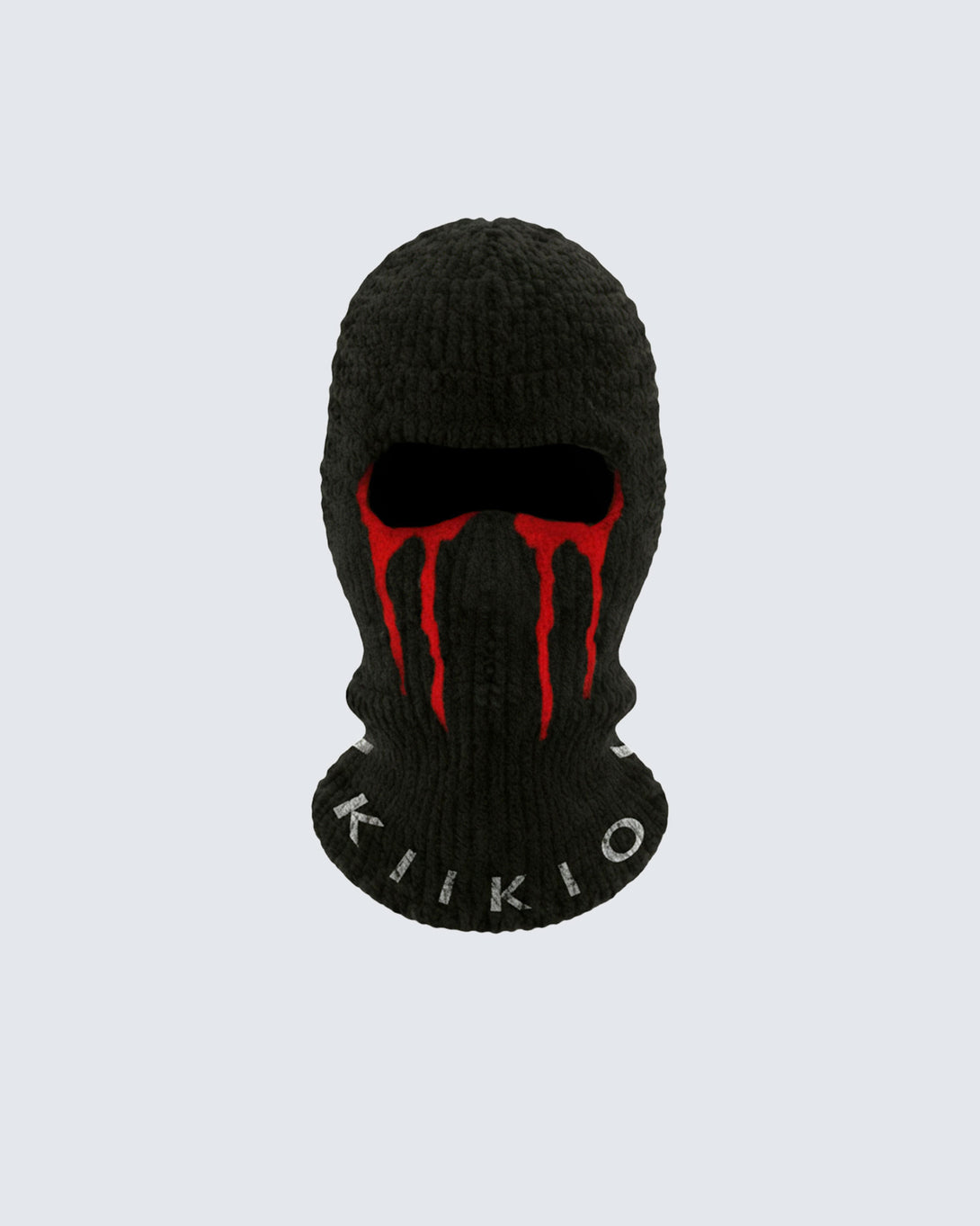 Red graphic accents, full-face knit design with eye opening, ribbed stretch texture, bold streetwear aesthetic