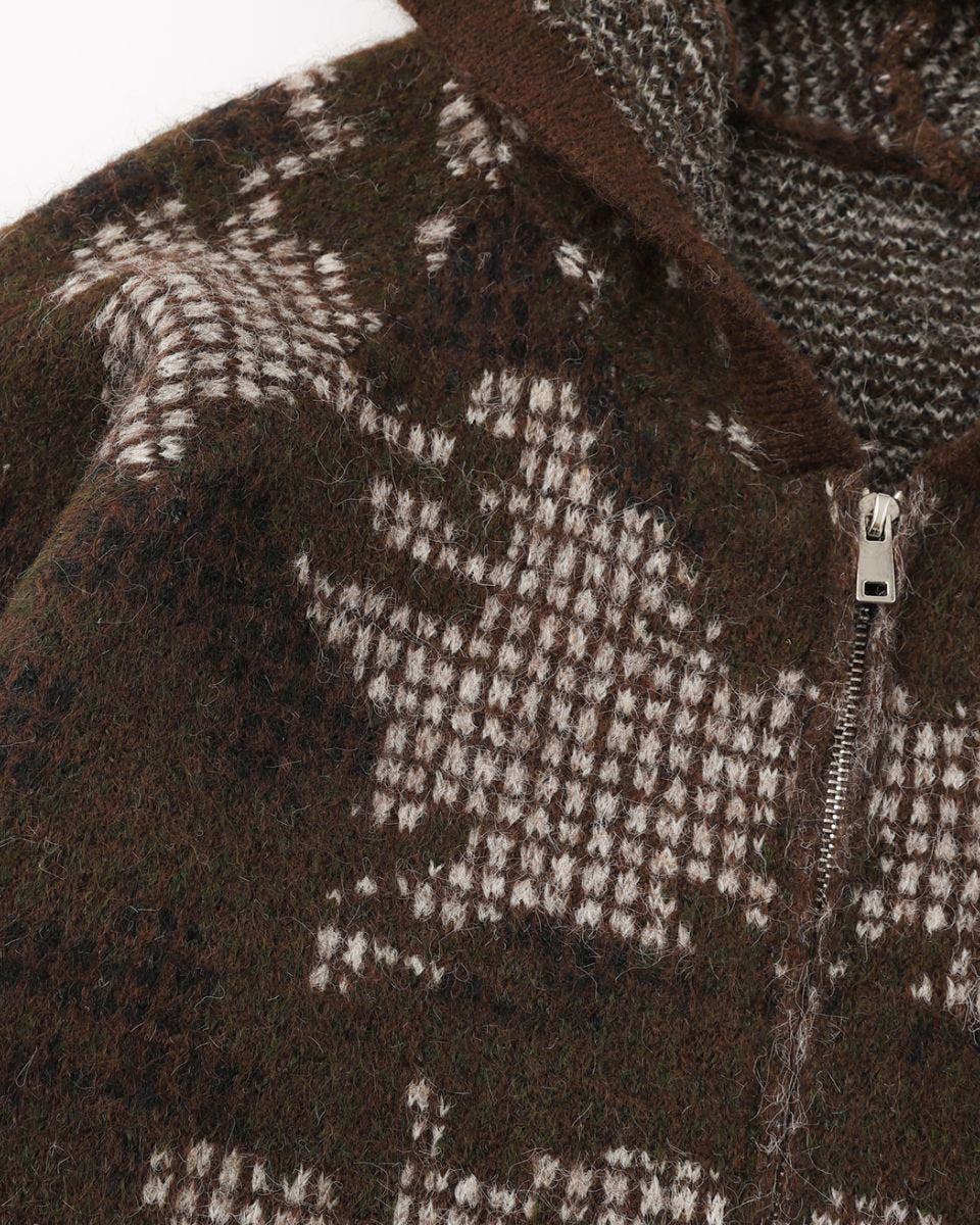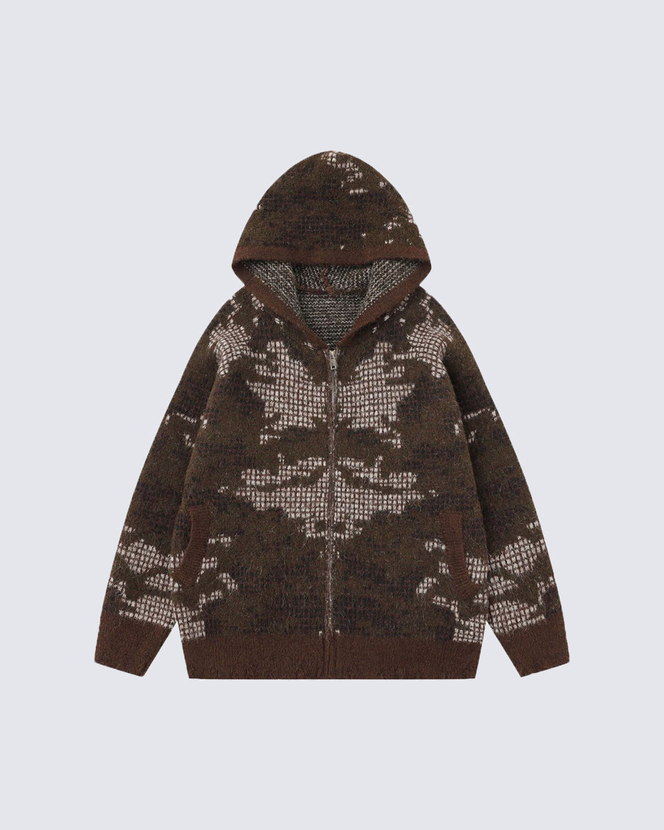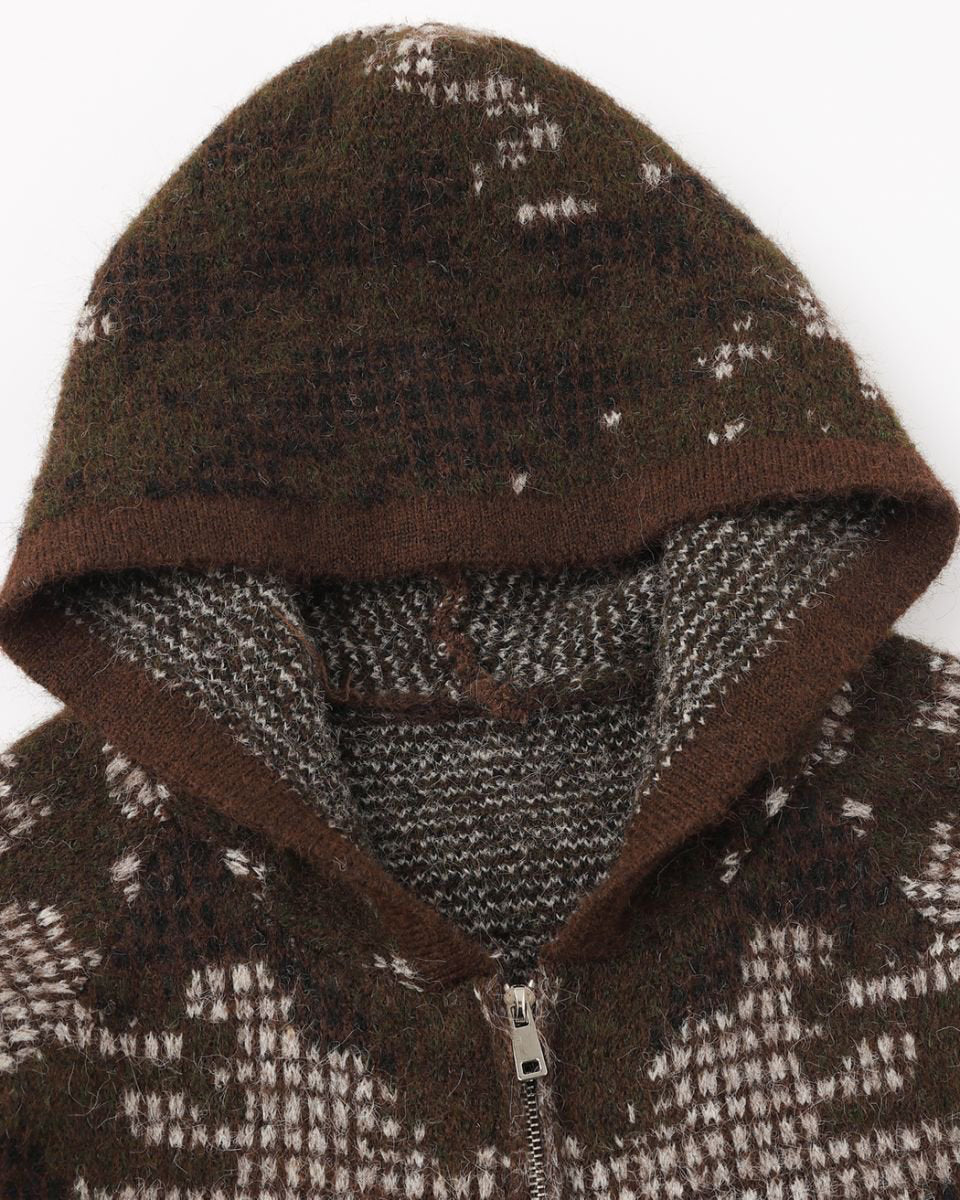 Design Elements: Artistic jacquard pattern, hooded design, front zipper closure, soft textured knit, side pockets, relaxed fit