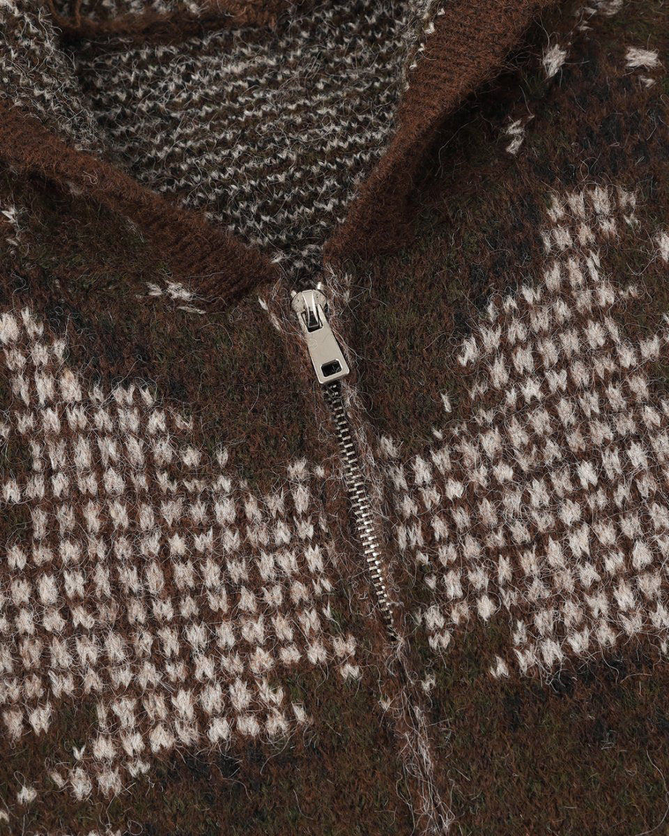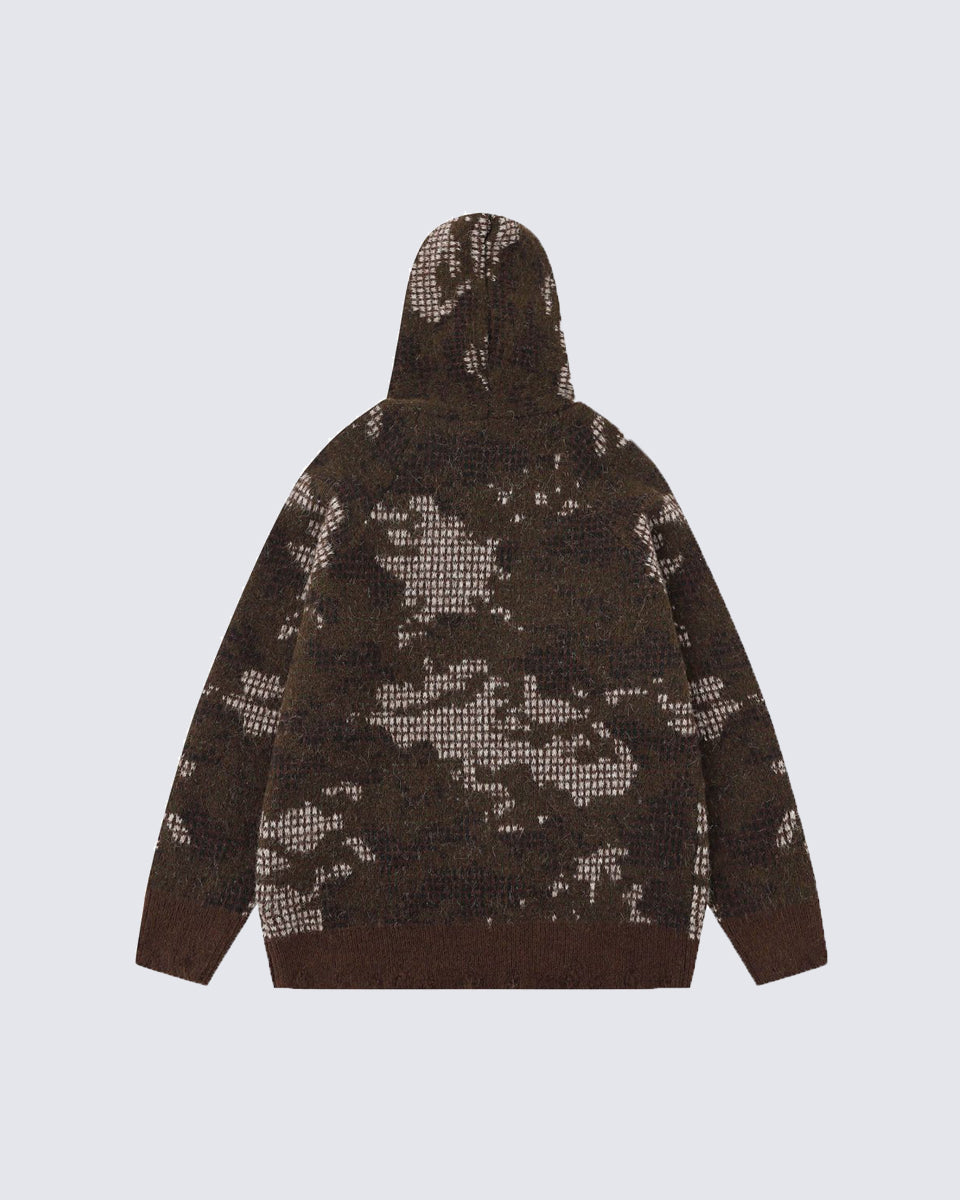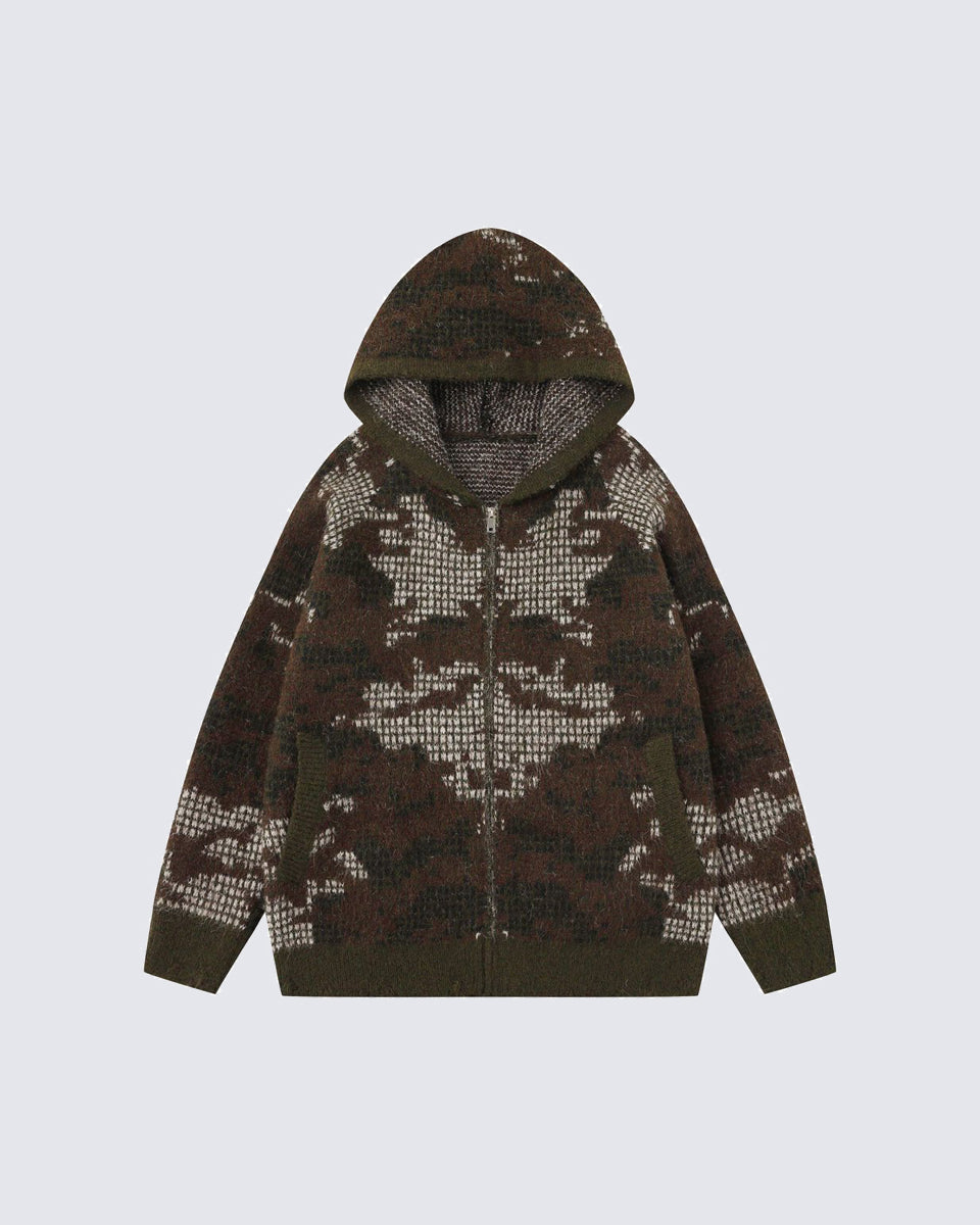 Design Elements: Artistic jacquard pattern, hooded design, front zipper closure, soft textured knit, side pockets, relaxed fit