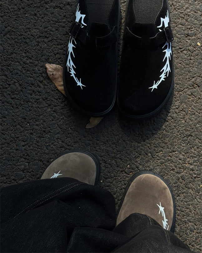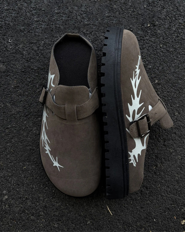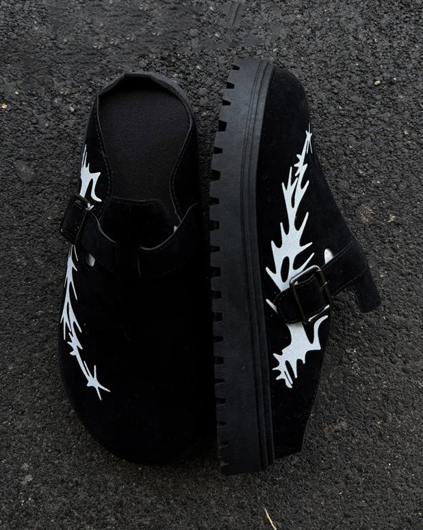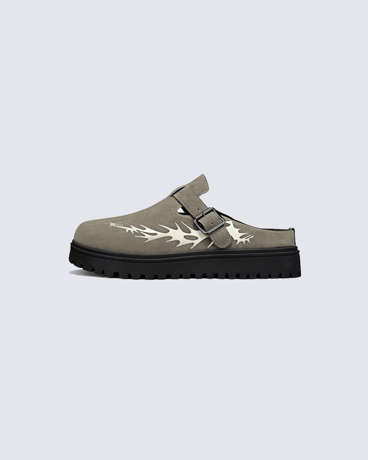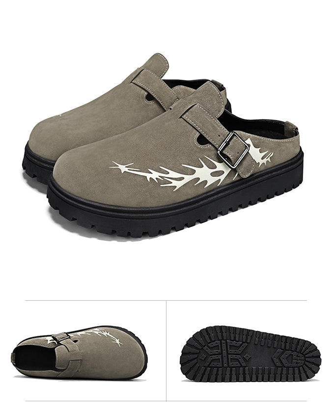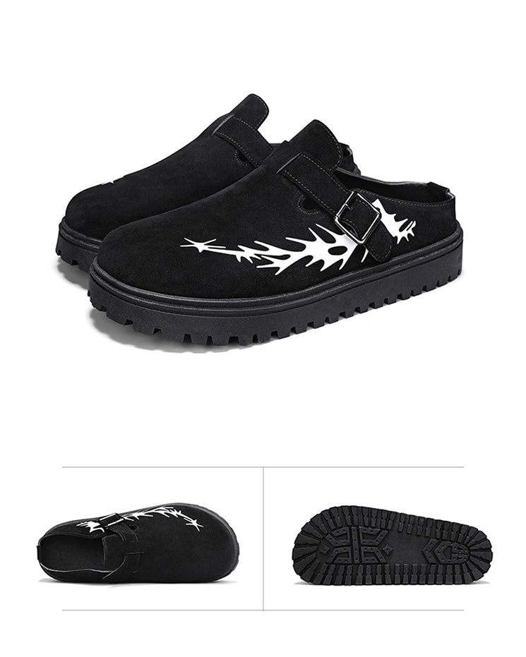 Closed-toe design, leather upper, bold graphic pattern, adjustable buckle strap, chunky PVC sole, slip-on mule style