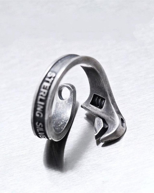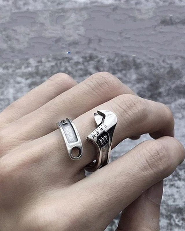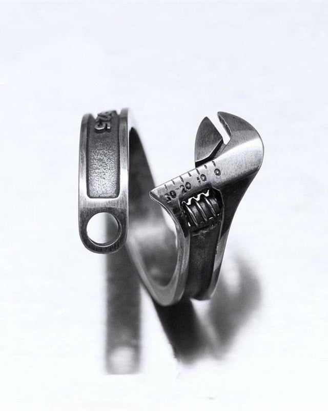 Miniature wrench shape, distressed metallic finish, adjustable open design, vintage industrial style, unisex accessory, minimalist mechanical aesthetic