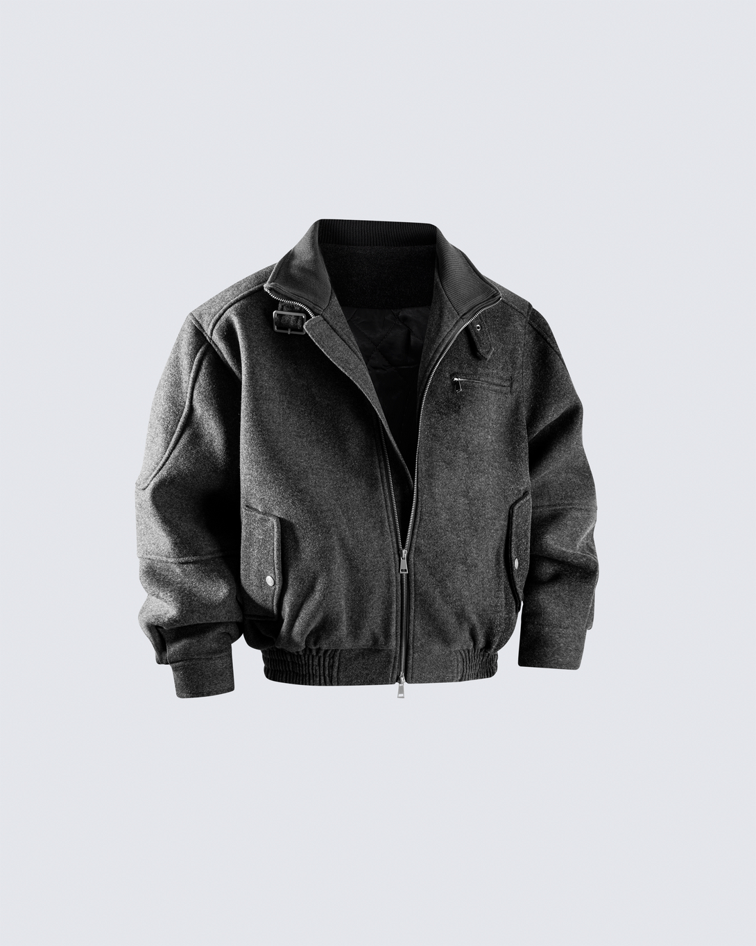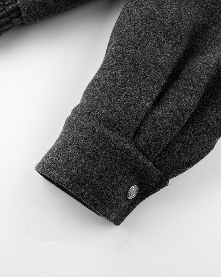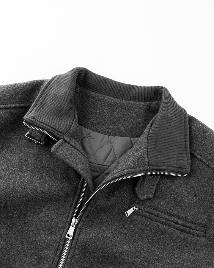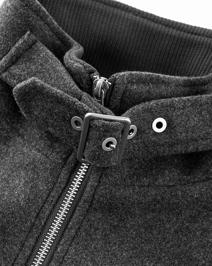 Design Elements: Stand collar buckle design, woolen fabric, zip-up front, flap hand pockets, ribbed hem and cuffs