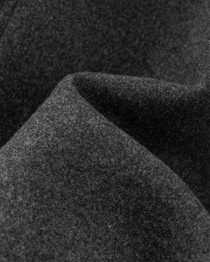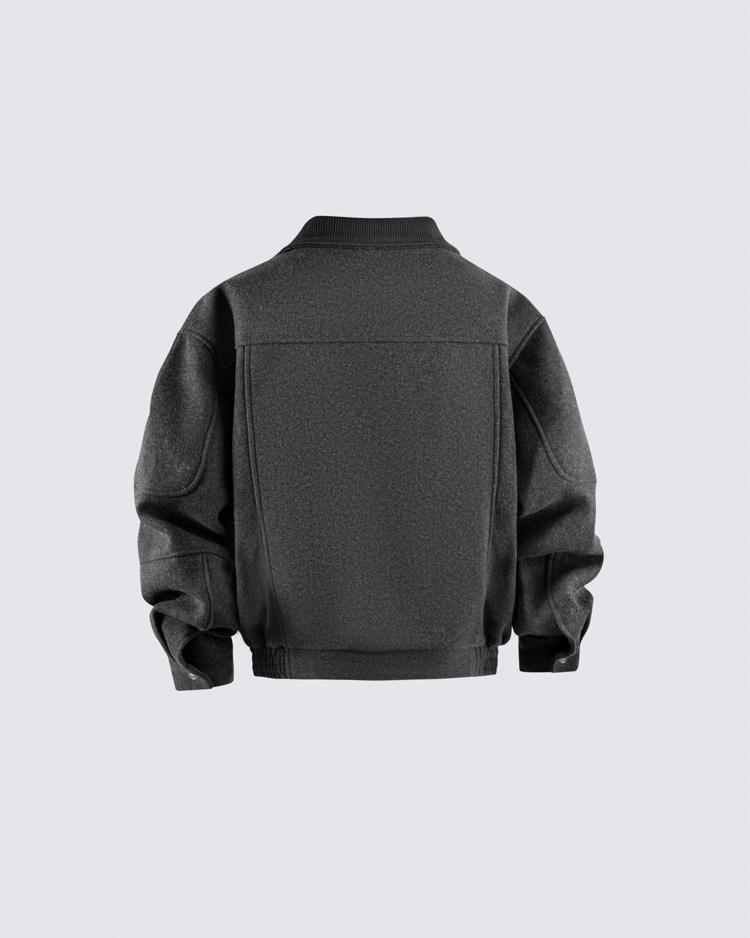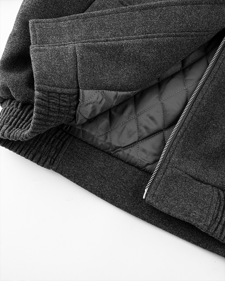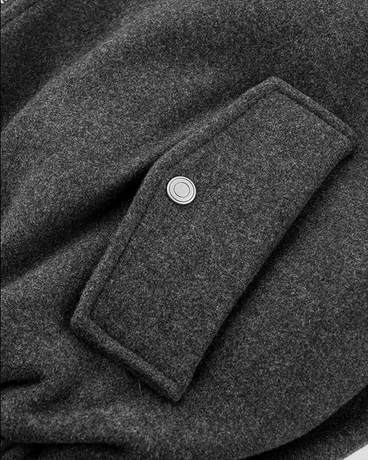 Design Elements: Stand collar buckle design, woolen fabric, zip-up front, flap hand pockets, ribbed hem and cuffs