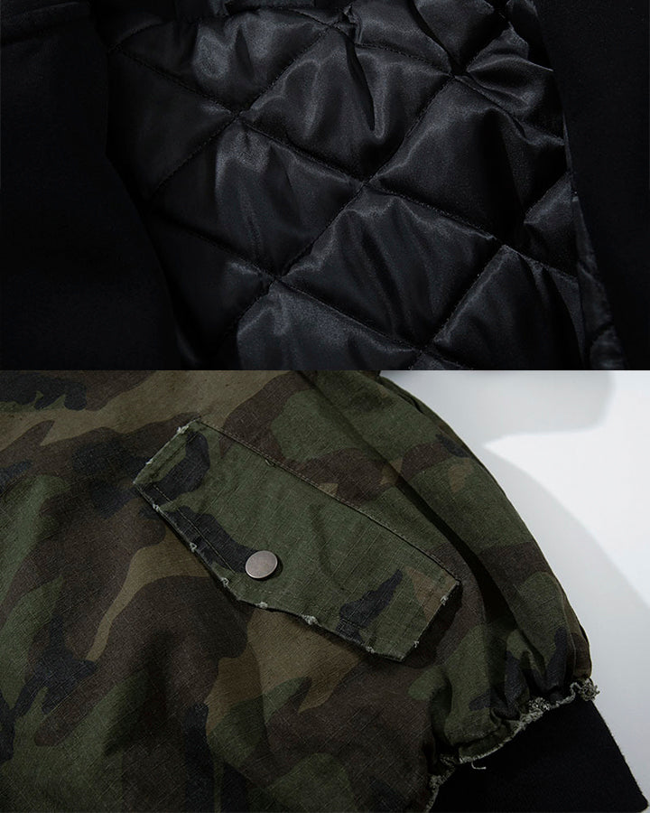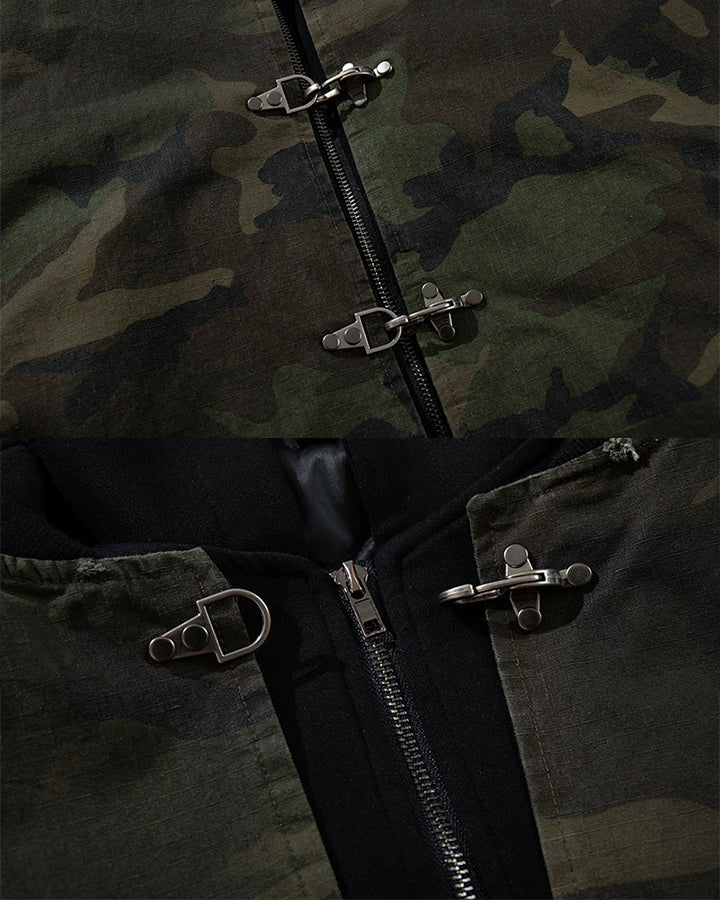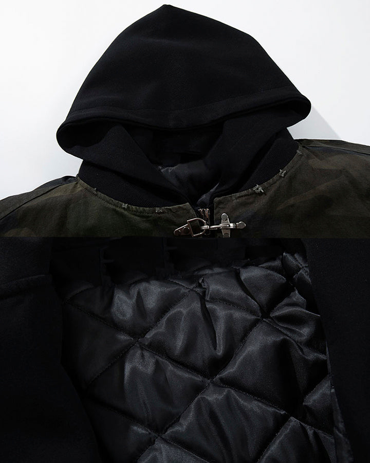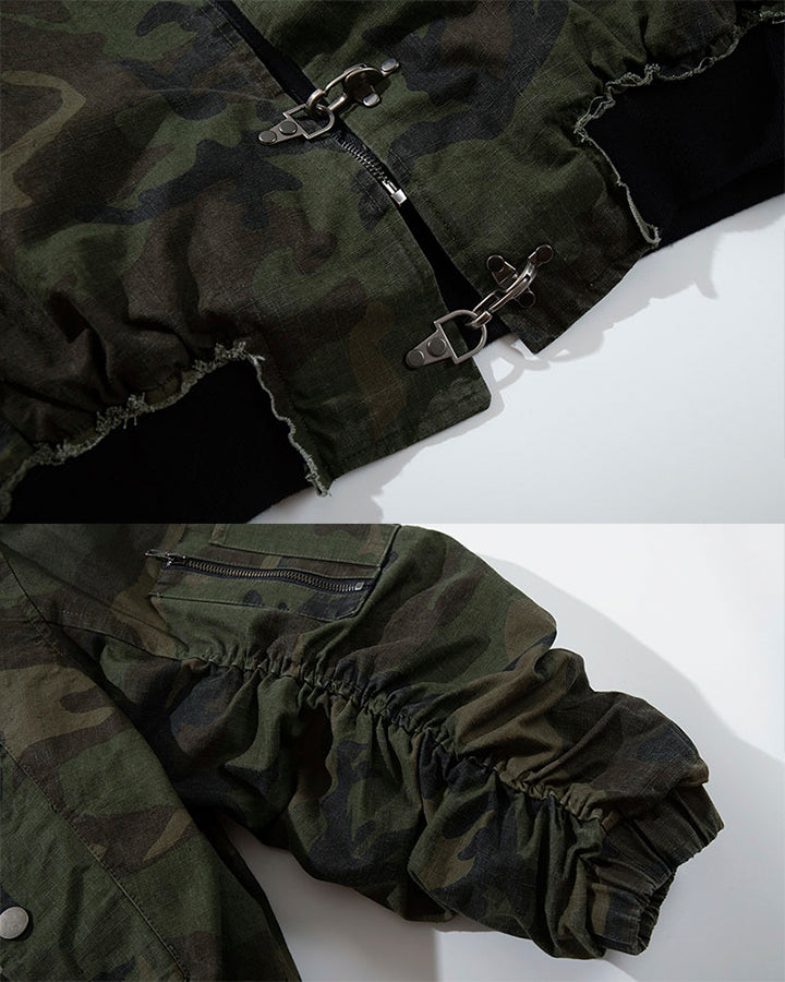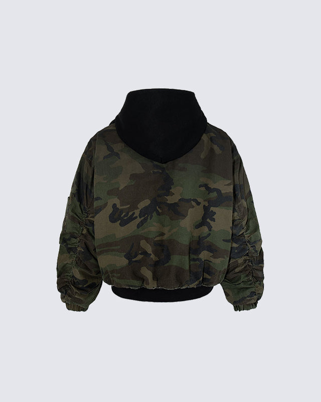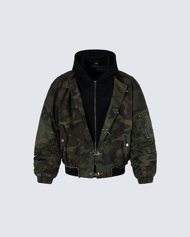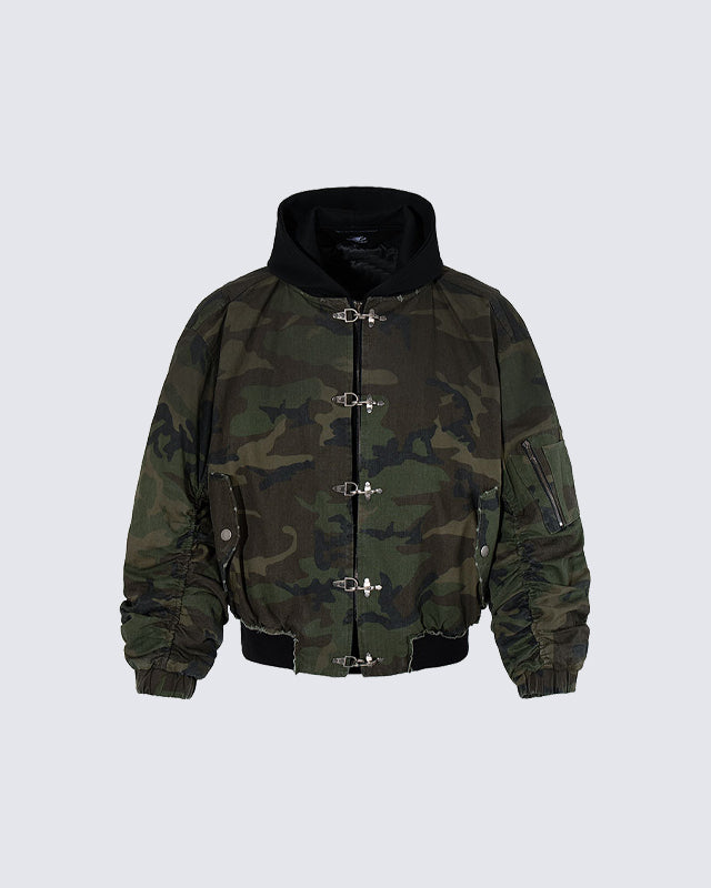 Camouflage print, detachable layered-look hood, metal buckle closures, zippered sleeve pocket, ruched sleeves, bomber silhouette