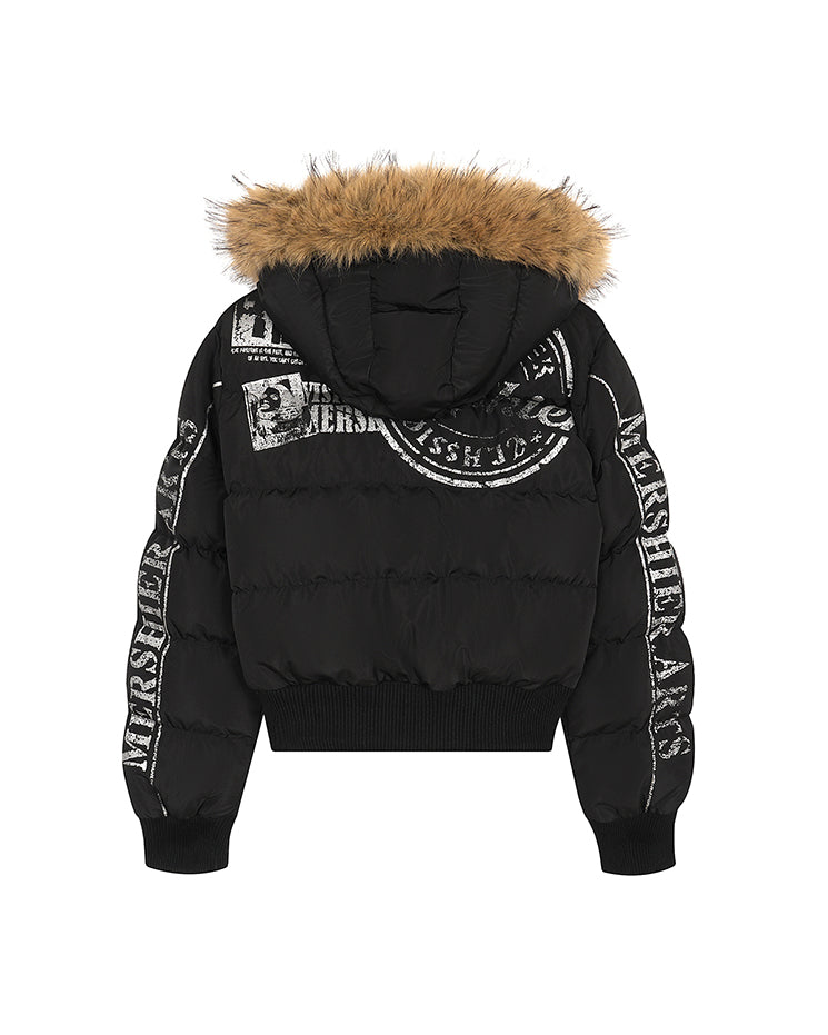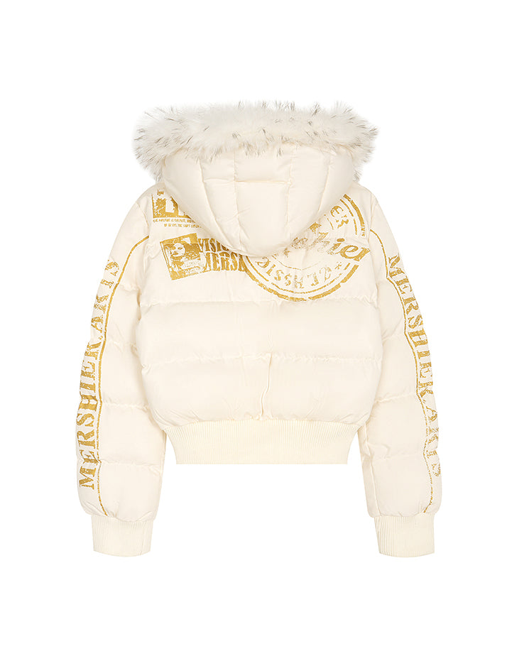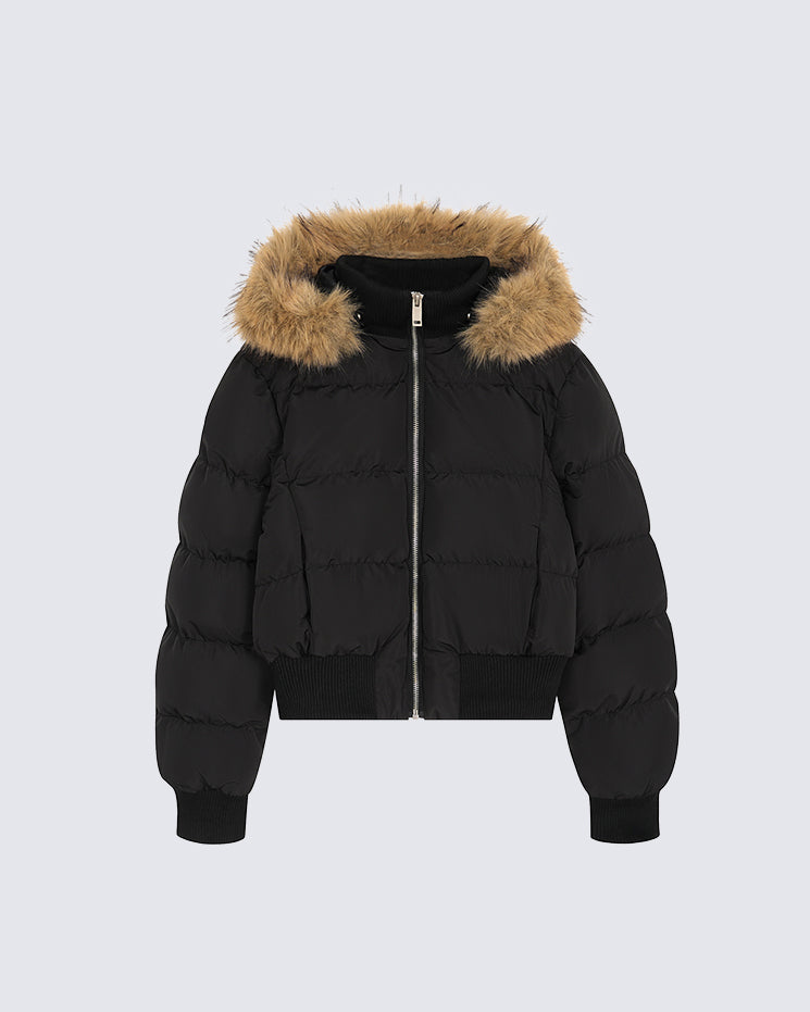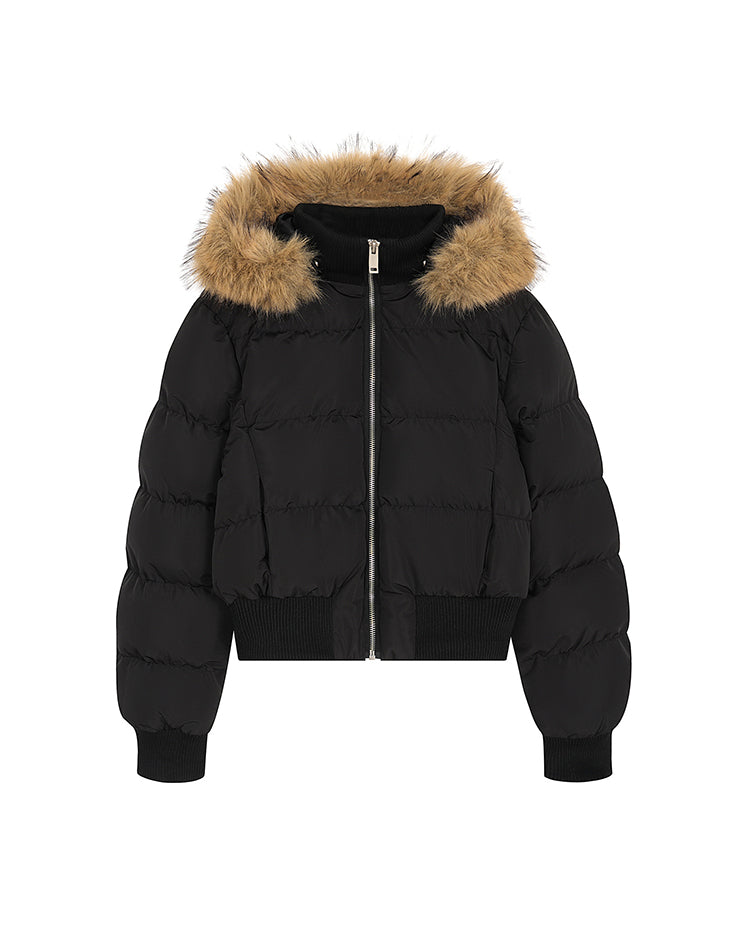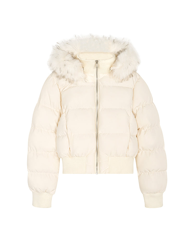 Faux fur collar, cropped puffer silhouette, ribbed cuffs and hem, zip-up front, and minimalist oversized structure.