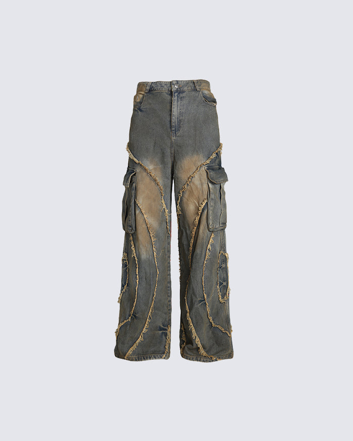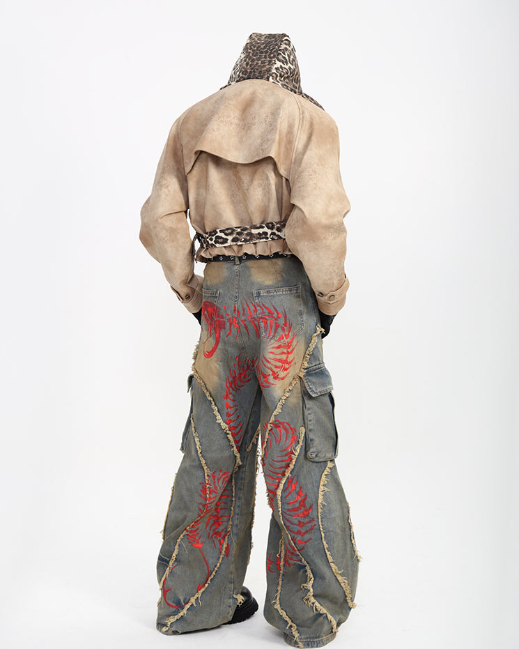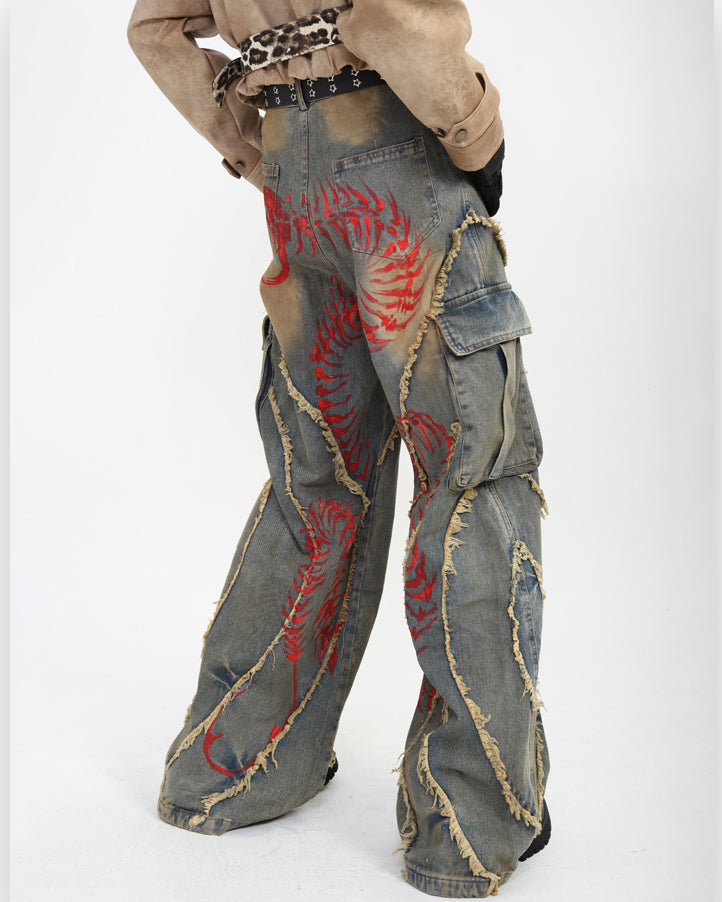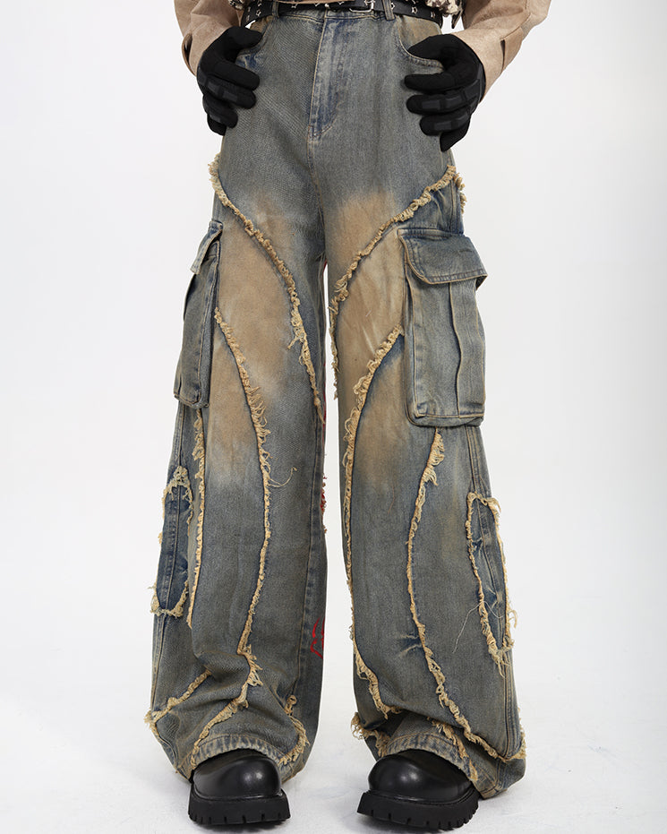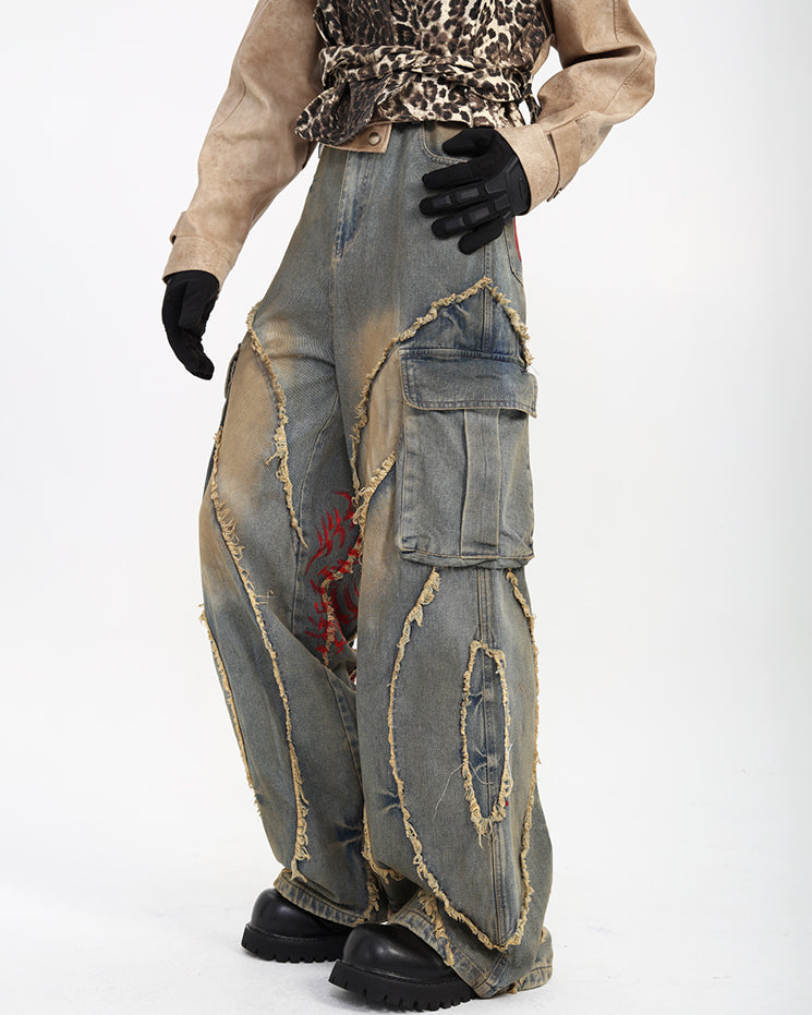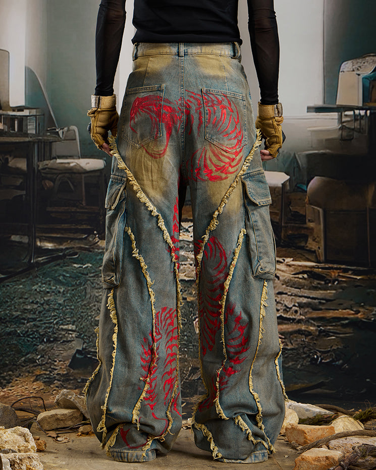 Distressed and hand-painted finish, irregular stitching details, multi-pocket cargo design, wide-leg silhouette, and vintage wash effect.