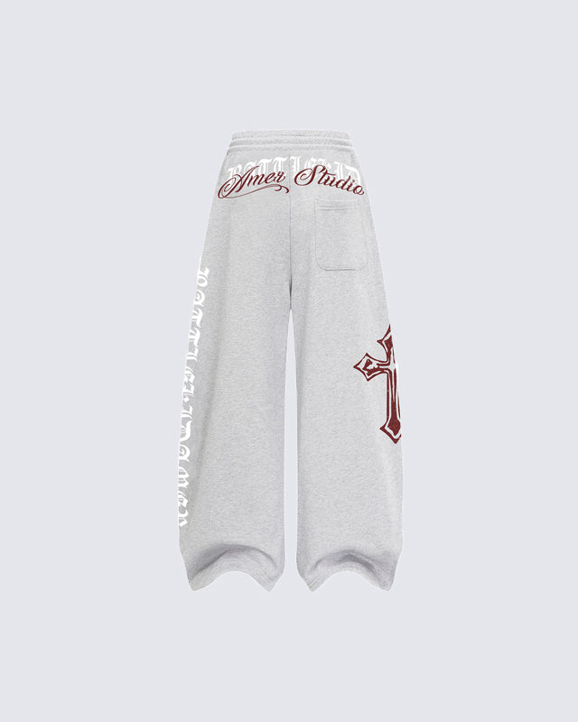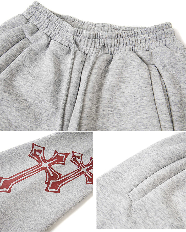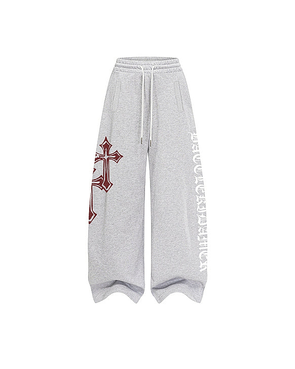 Elastic waistband, Gothic letter and cross print, wide-leg silhouette, back pocket design, and ribbed cuffs for a stylish, relaxed fit.