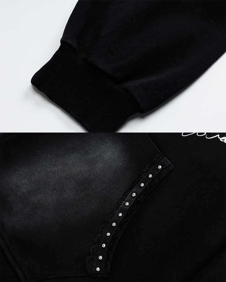 Design Elements: Oversized bunny ear hood, gothic butterfly print, metal safety pin accents, rivet pocket details, washed black texture