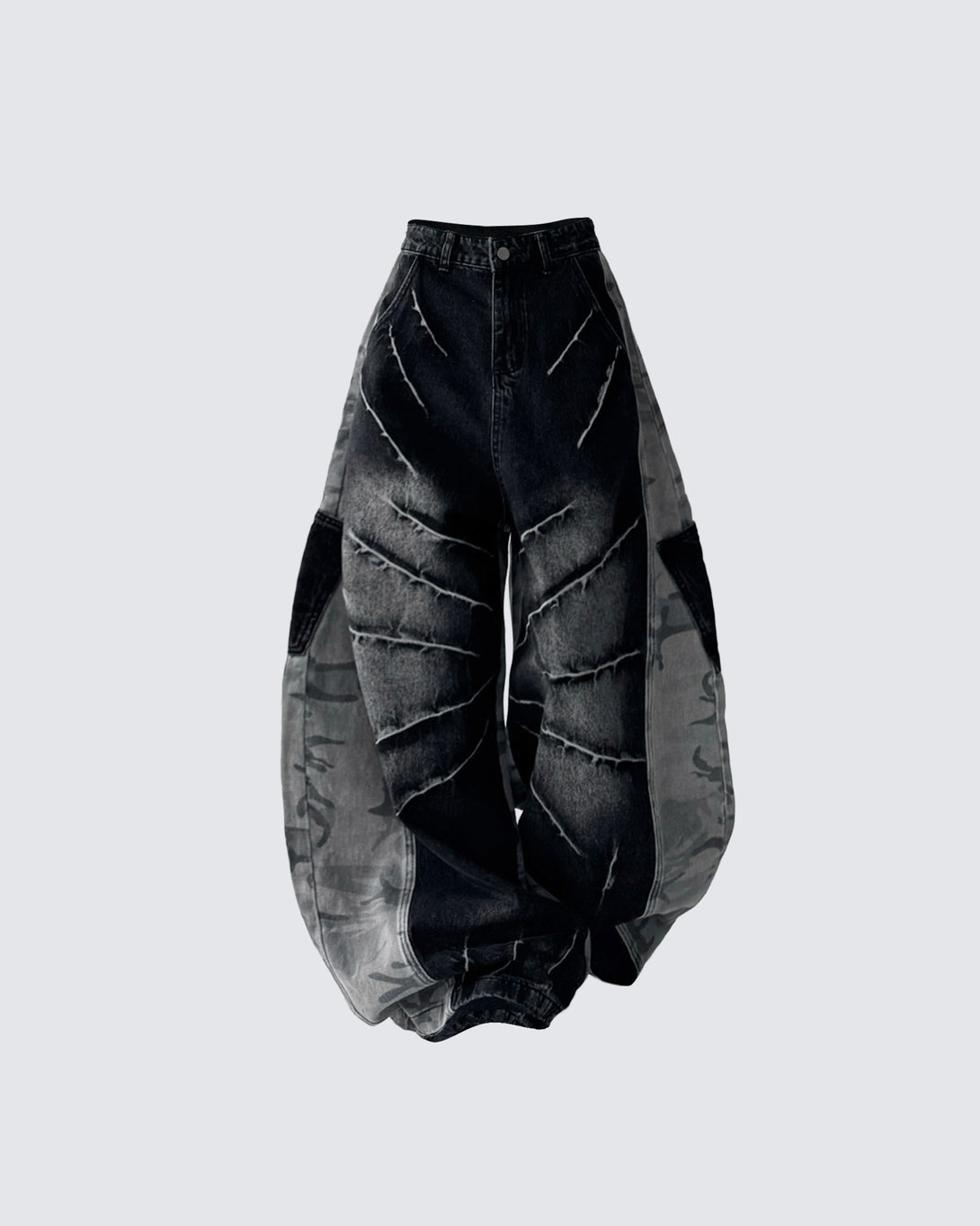 Features a retro American lightning camo wash with bold patchwork detailing, oversized utility pockets, and a flared blade-cut silhouette for a street-ready vintage look.