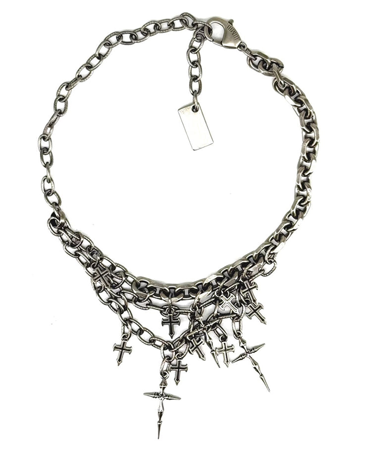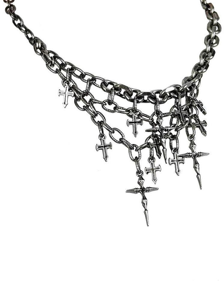 Layered irregular chain design, cross and spike pendants, metallic finish, adjustable clasp closure, edgy minimalist aesthetic