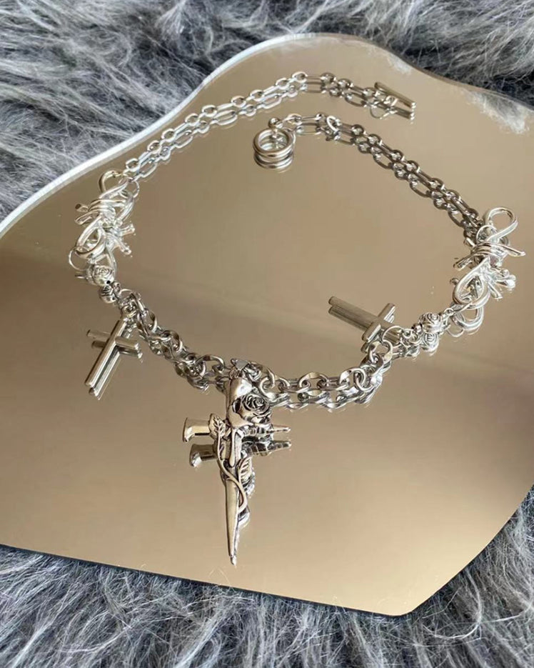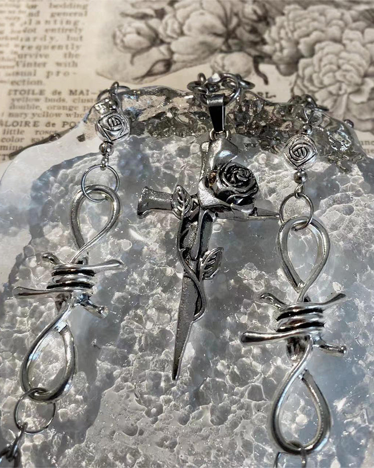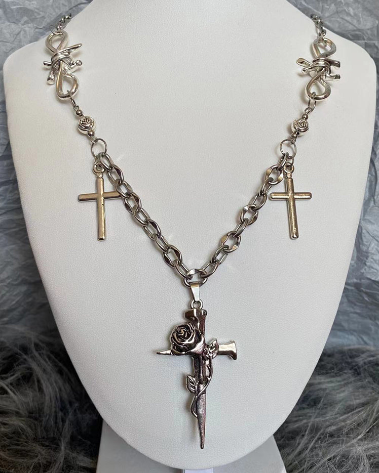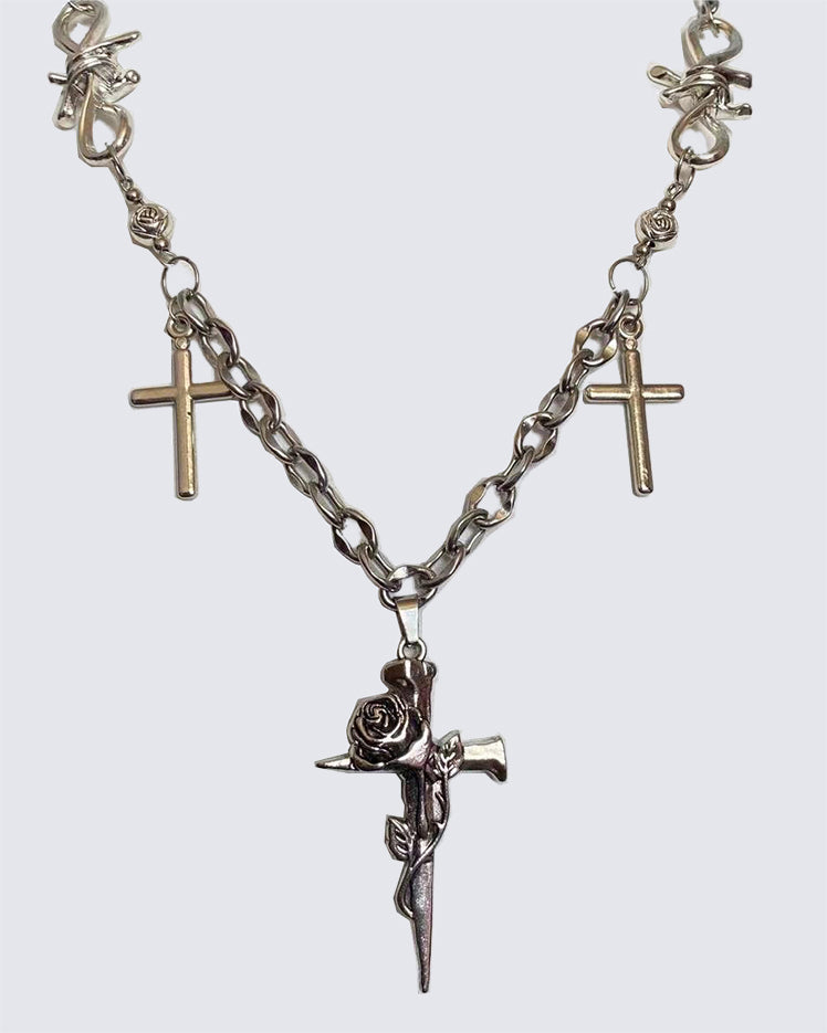 Rose and cross pendant design, polished titanium steel, double-layer chain, vintage gothic style, durable texture, statement accessory